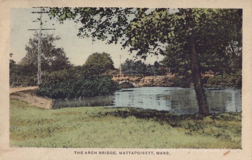 Hand-colored postcard showing The Arch Bridge, Mattapoisett, Mass. Handwritten note on reverse to Mrs. R. Ward, 155 Park St., W. Roxbury, Mass. from Ellis. Postmarked month not legible; year 1933 from Mattapoisett, Mass.Collection