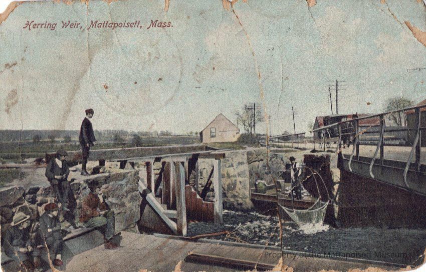 Hand-colored postcard showing Herring Weir, Mattapoisett, Mass. Hand-written note to Mr. John J. Sylvia, Jr., P. O. Box 16, Oxford, Mass. from his sister, Mary. Postmarked Mattapoisett, Mass., date not legible. Additional note stating "property of Joseph Nanes".Collection