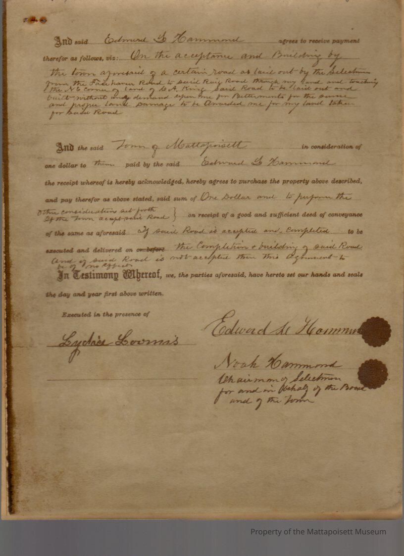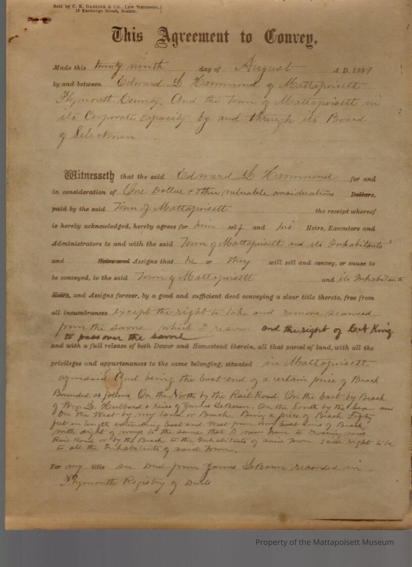 Edward L. Hammond to Town of Mattapoisett (Noah Hammond as Chairman of the Selectmen), land at the east end of the beach, south of railroad, except for the right to remove and take seaweed and a right of way for C. A. King. $1 and other valuable considerations.Collection
