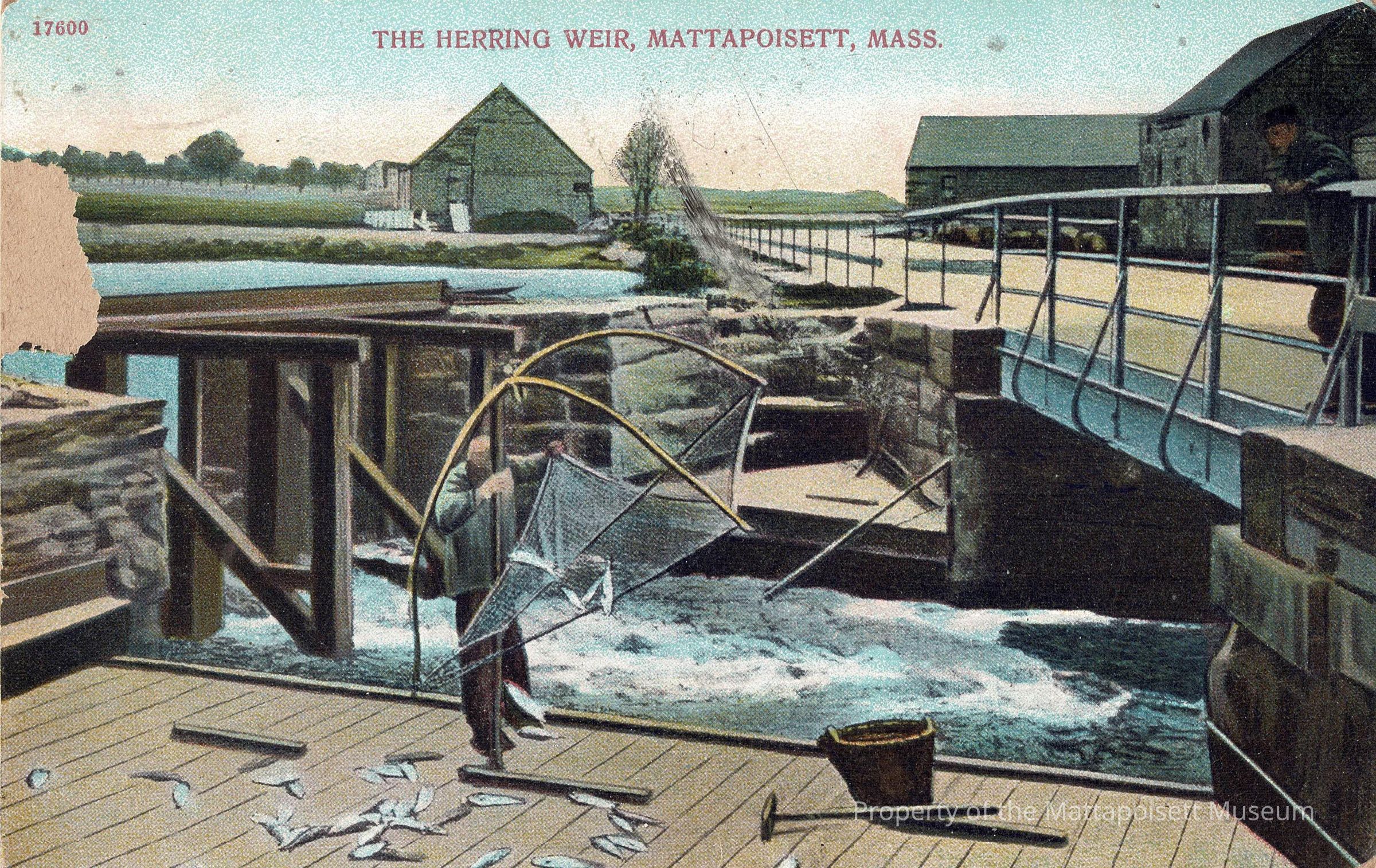 Hand-colored postcard showing The Herring Weir, Mattapoisett, Mass. Hand-written note to Mrs. Amelia Pine, 69 West St., City. Postmarked New Bedford, Mass, Jul 7, 1909.Collection