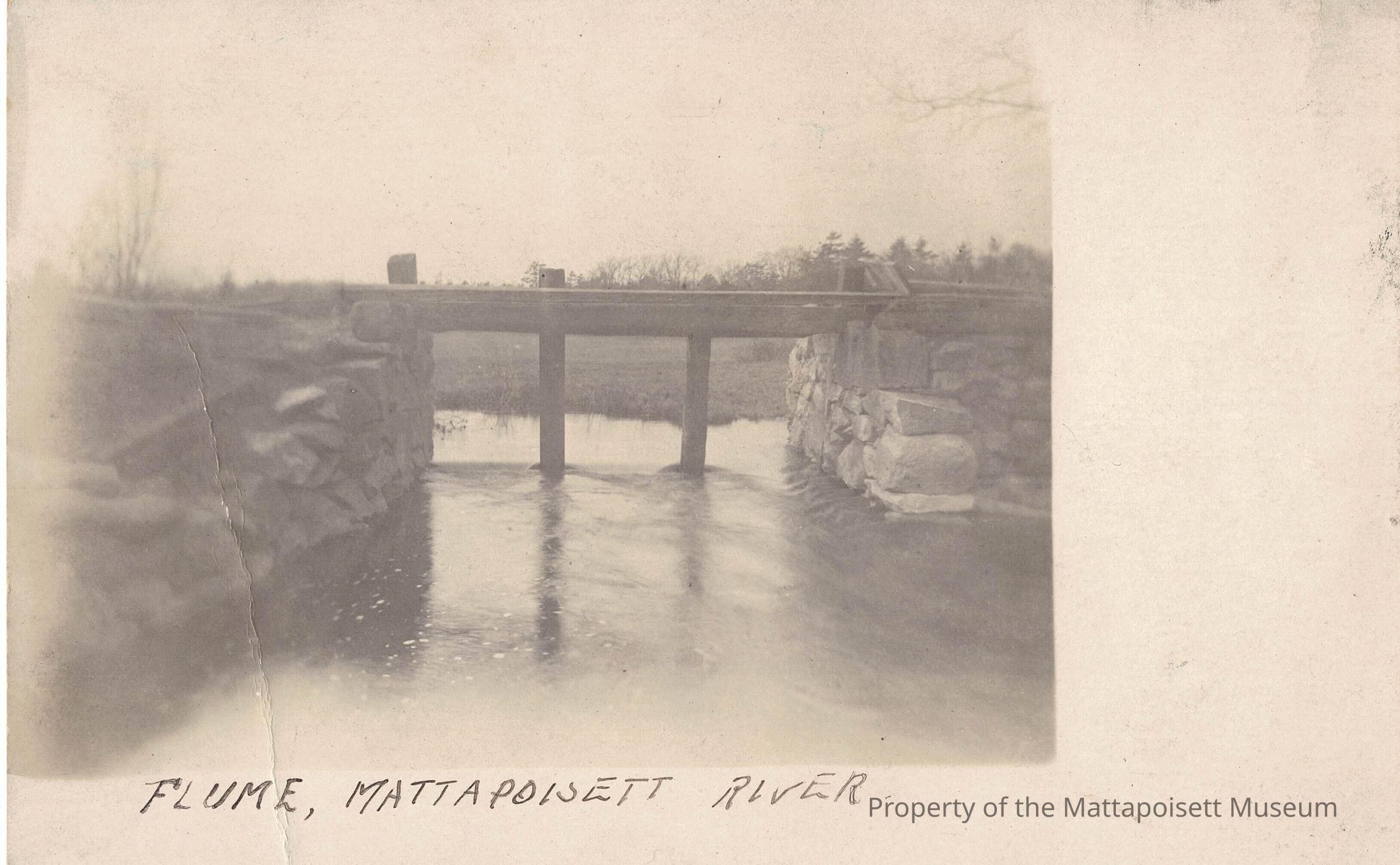 Black and white postcard showing Flume, Mattapoisett River.Collection