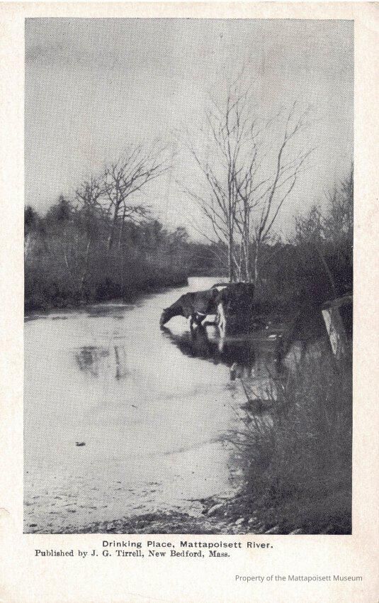 Black and white postcard showing Drinking Place, Mattapoisett River.Collection