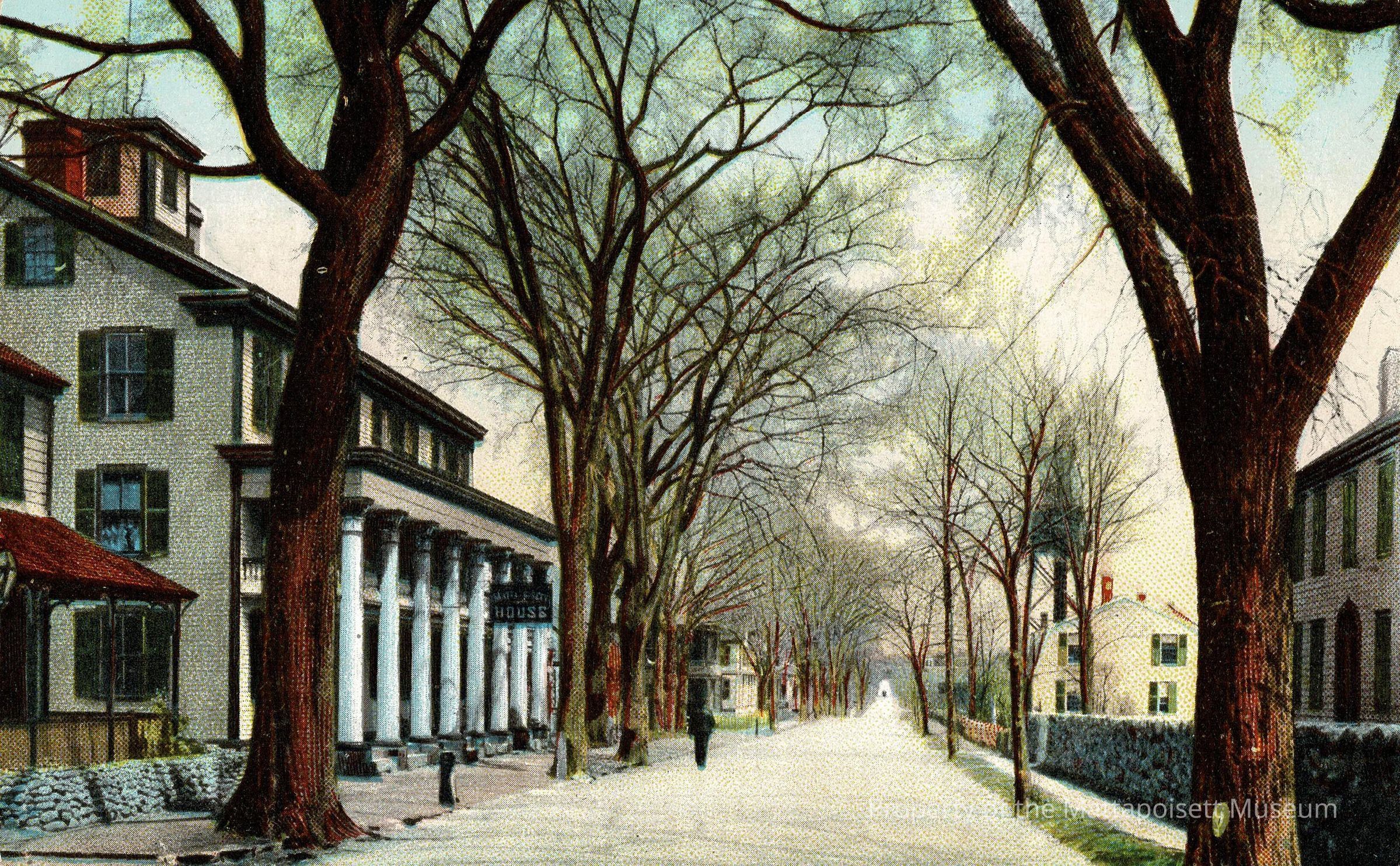 Hand-colored postcard showing Along Main Street, Mattapoisett, Mass. Hand-written note to Miss Helen Dwight, Elmhurst Convent, Providence, R.I., from Susan. Postmarked from Mattapoisett, Mass., June 8, 1910.Collection