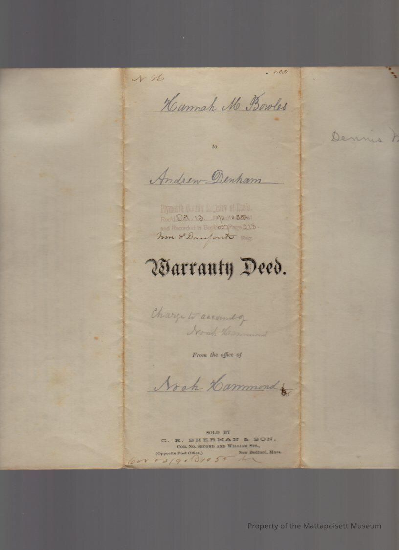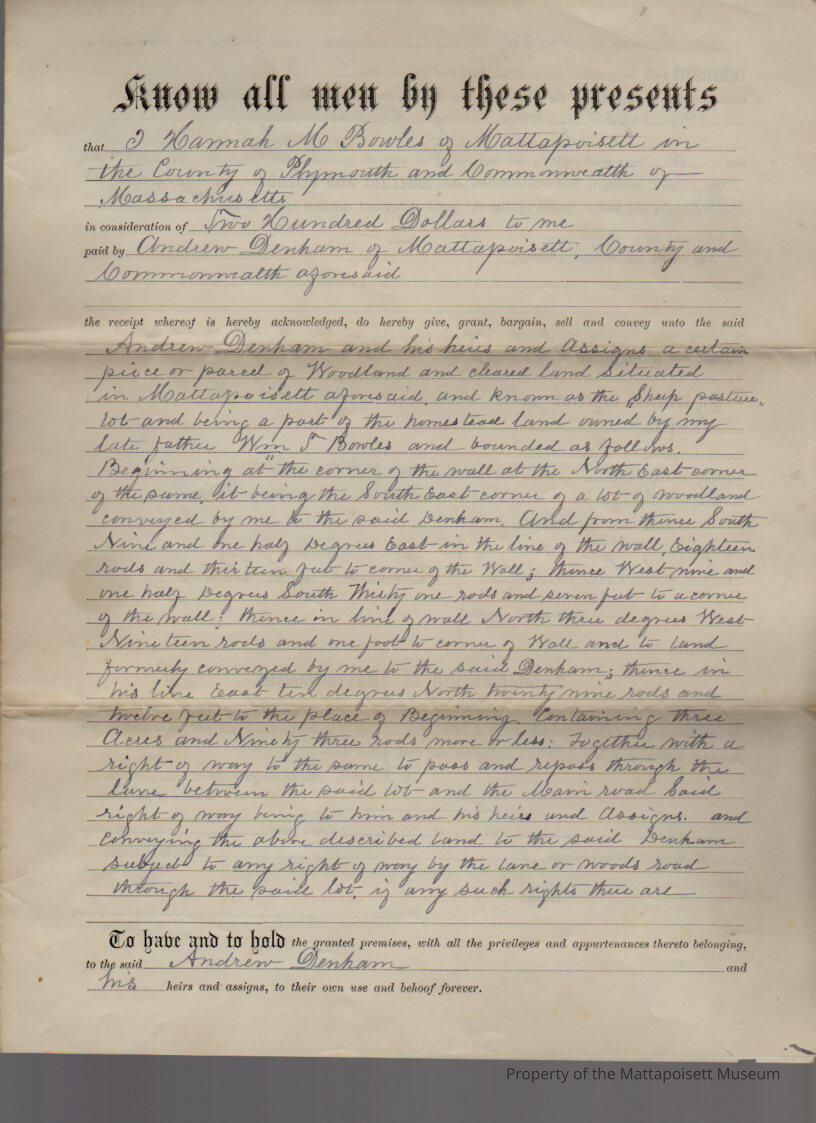 Hannah M. Bowles to Andrew Denham, 3 acres, 93 rods wood & cleared land known as "Sheep Lot" for $200.Collection