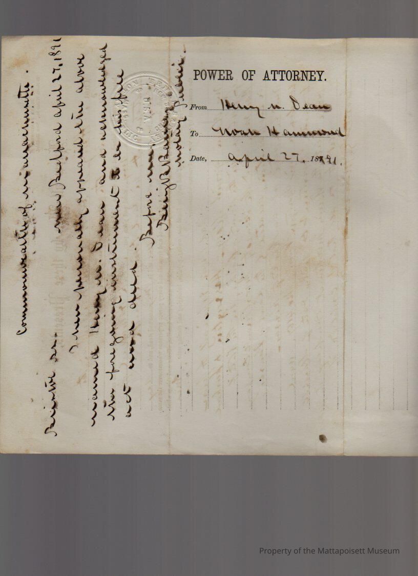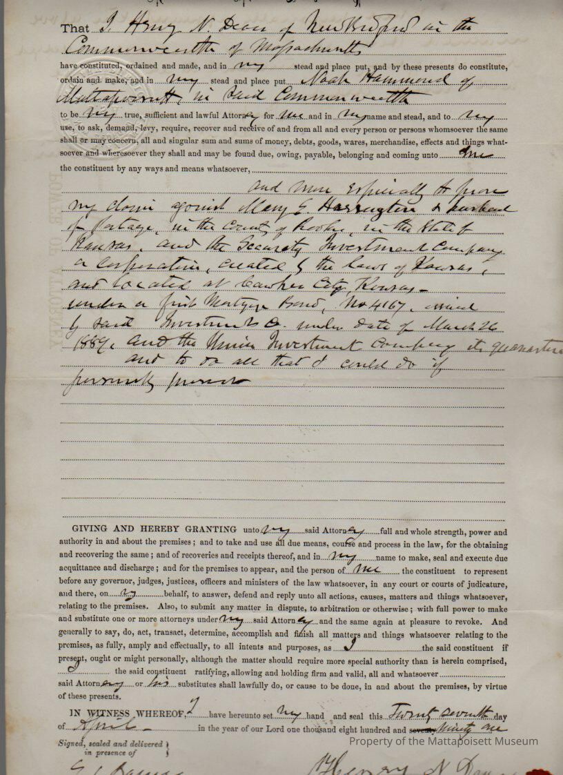 Henry N. Dean of New Bedford, Power of Attorney to Noah Hammond to represent in all matters and claims concerning bonds or mortgages against Mary E. Harrington and husband of Partage, KS, assigned by Security Investment Company of Cawker City, KS and Union Investment Company, Kansas City, MO, guaranteed by same.Collection