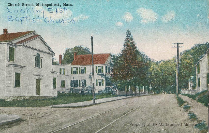 Hand-colored postcard showing Church Street, Mattapoisett, Mass. Hand-written note states "looking East, Baptist Church". Pre-address Alice C. Ordway, North Street, Mattapoisett, Massachusetts.Collection