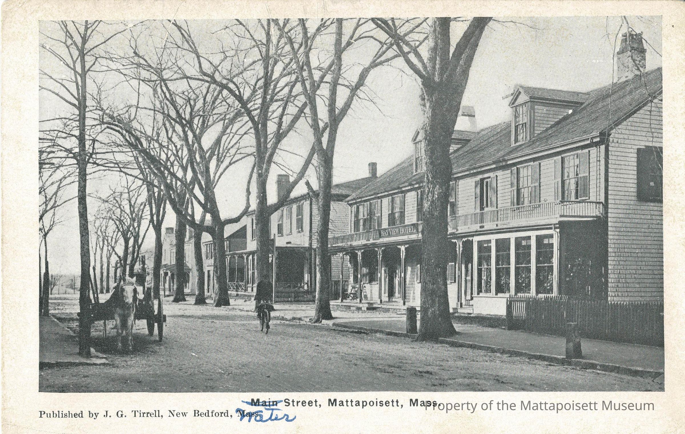 Black and white postcard showing Water Street, Mattapoisett, Mass.Collection