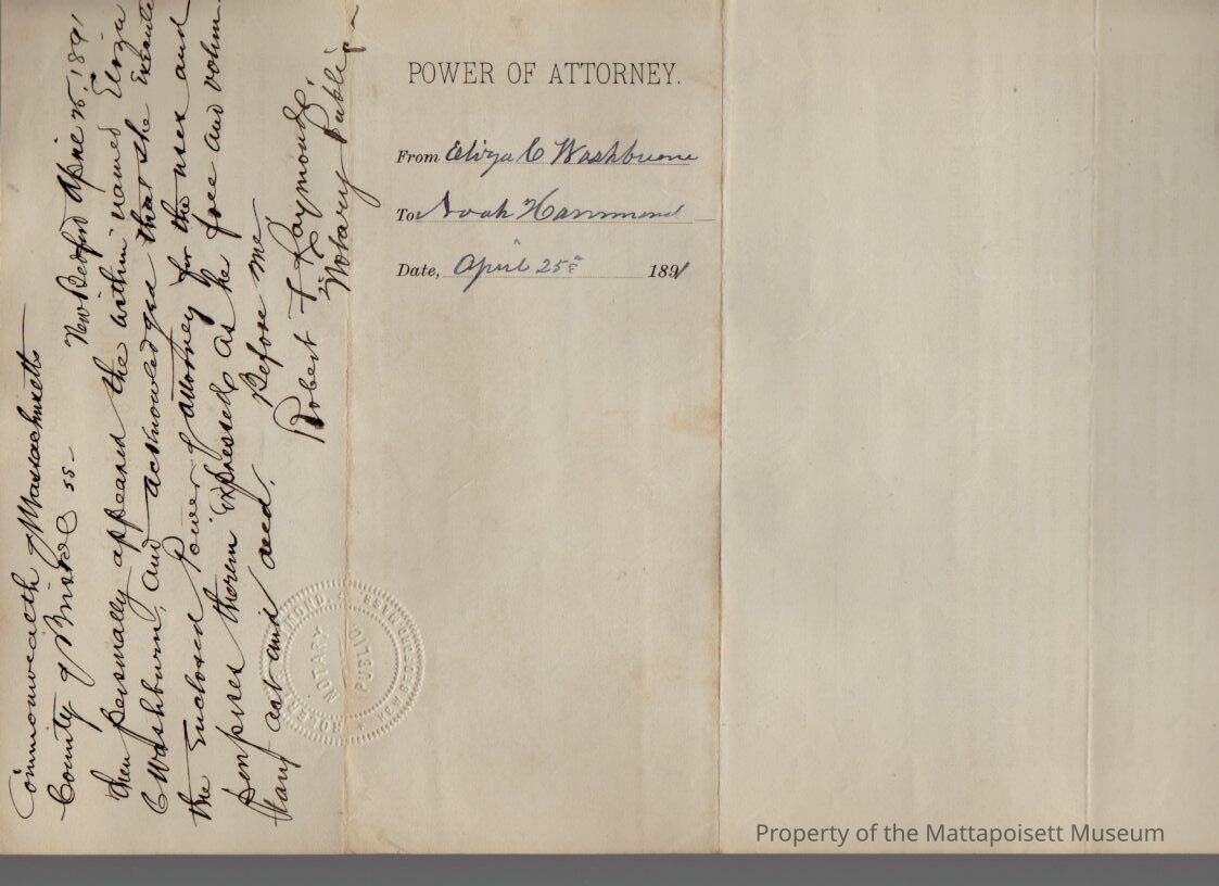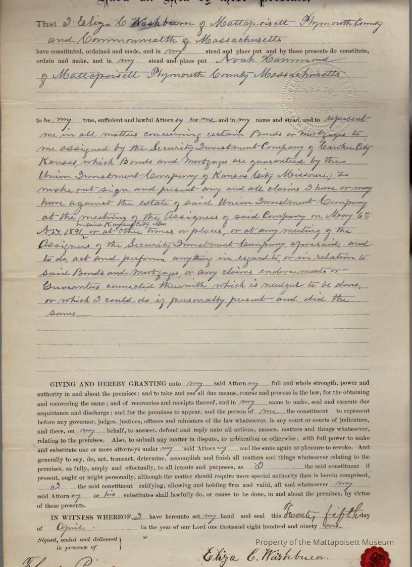 Eliza C. Washburn, Power of Attorney to Noah Hammond to represent in all matters and claims concerning bonds or mortgages assigned by Security Investment Company of Cawker City, KS and Union Investment Company, Kansas City, MO, guaranteed by same.Collection