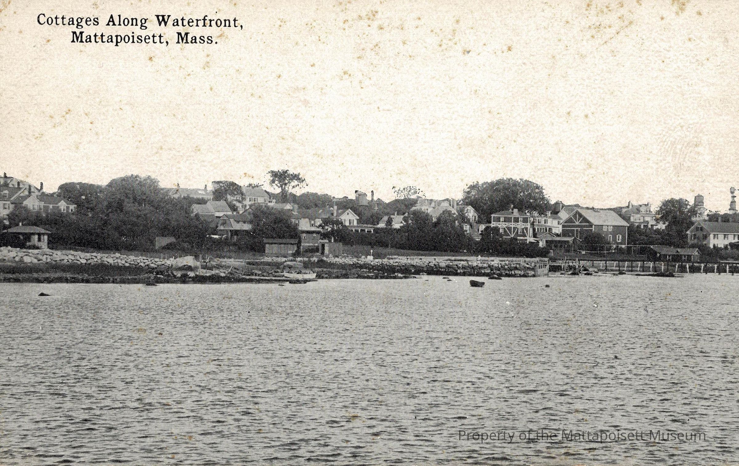 Black and white postcard showing Cottages Along Waterfront, Mattapoisett, Mass.Collection