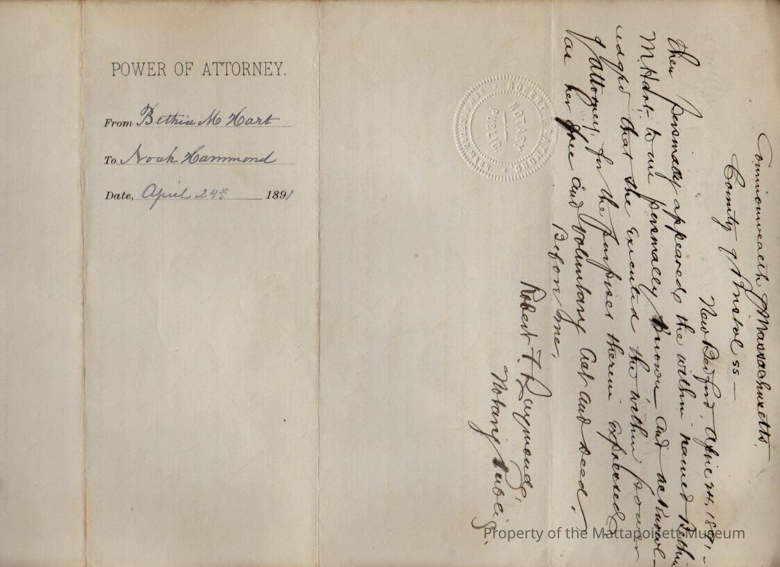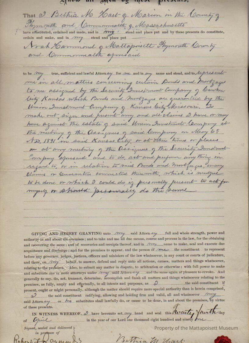 Bethia M. Hart of Marion, Power of Attorney to Noah Hammond to represent in all matters and claims concerning bonds or mortgages assigned by Security Investment Company of Cawker City, KS and Union Investment Company, Kansas City, MO, guaranteed by same.Collection