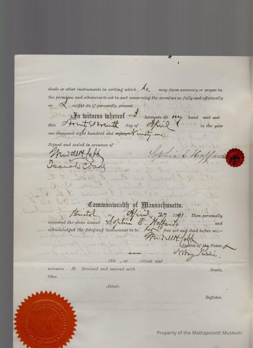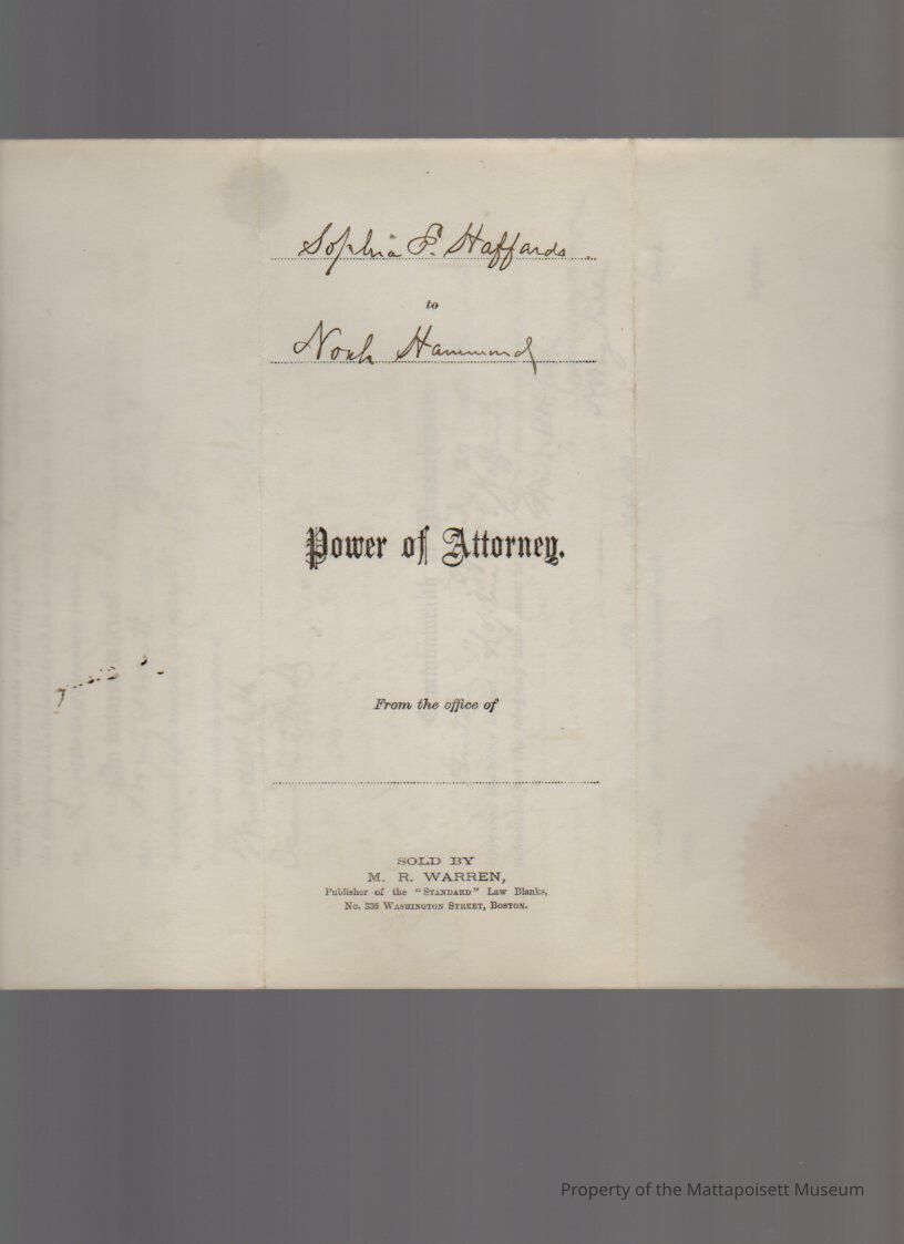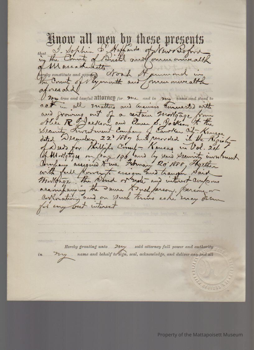 Sophia Haffords of New Bedford, Power of Attorney to Noah Hammond to represent in all matters and claims concerning bonds or mortgages of Alice R. & Elmer S. Jackson, assigned by Security Investment Company of Cawker City, KS and Union Investment CompanyCollection