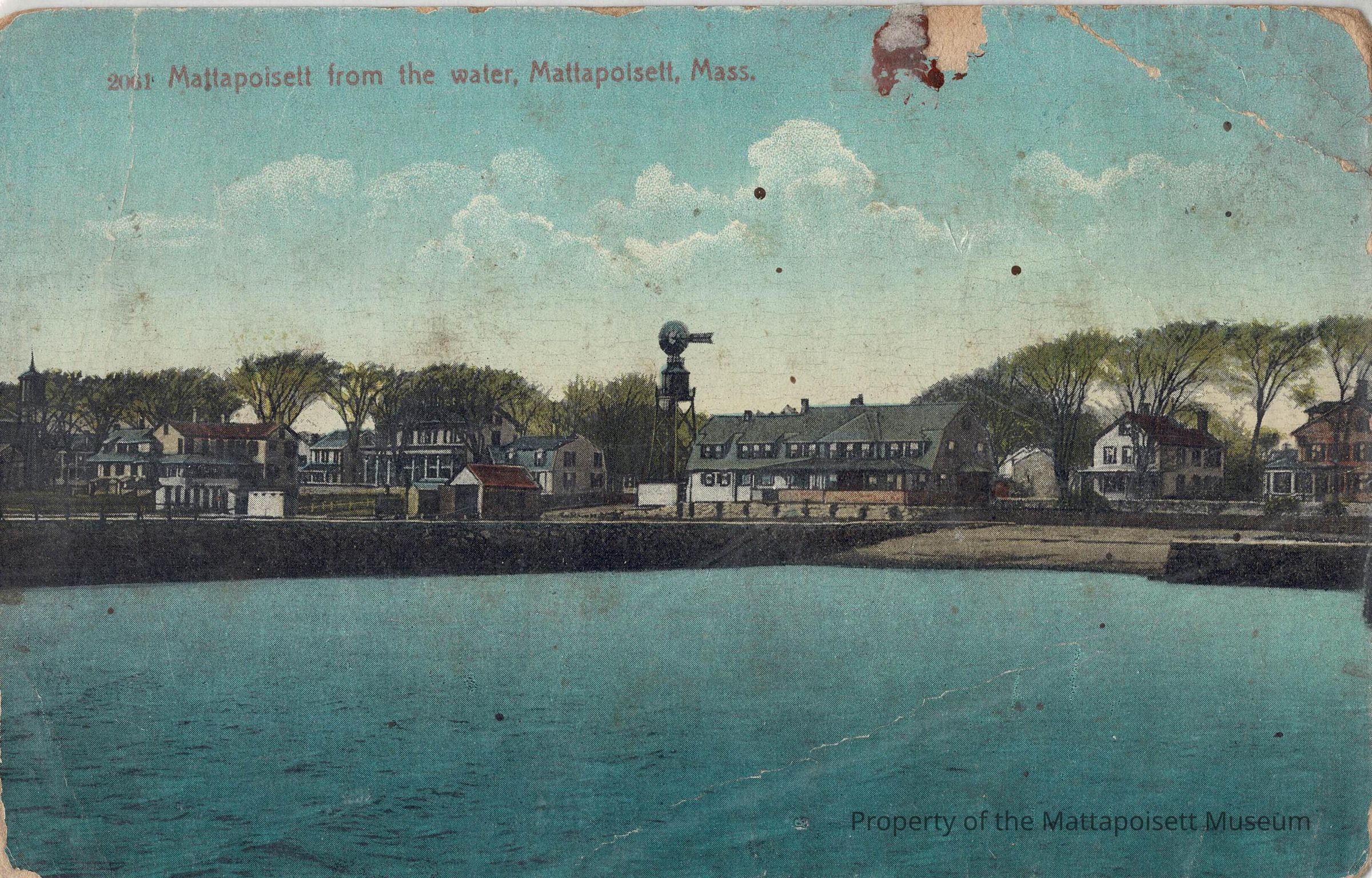 Hand-colored postcard showing Mattapoisett from the water, Mattapoisett, Mass. Hand-written note from M.V.G. 435 to Mrs. Erva L. Moore. No postmark but dated 2/25/1936.Collection