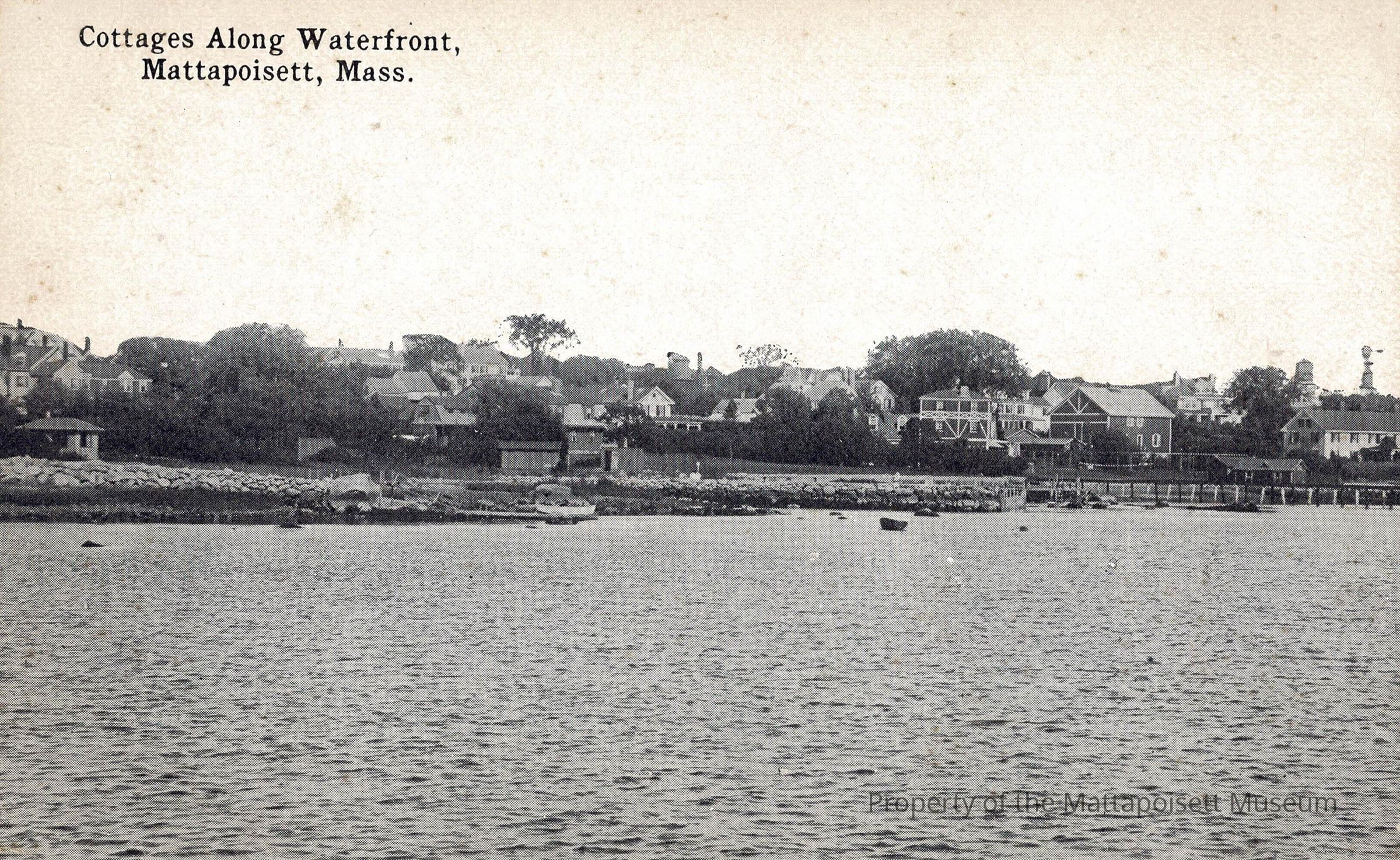 Black and white postcard showing Cottages Along Waterfront, Mattapoisett, Mass.Collection