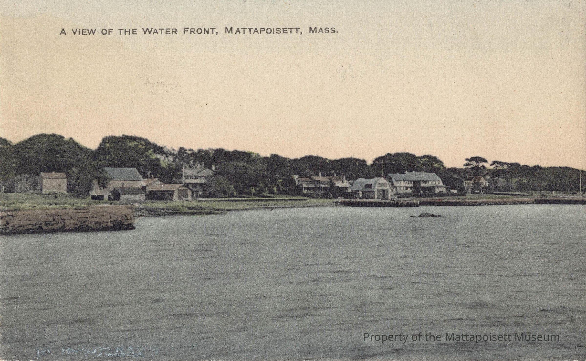 Hand-colored postcard showing A View Of The Water Front, Mattapoisett, Mass. Pre-address Alice C. Ordway, North Street, Mattapoisett, Massachusetts.Collection
