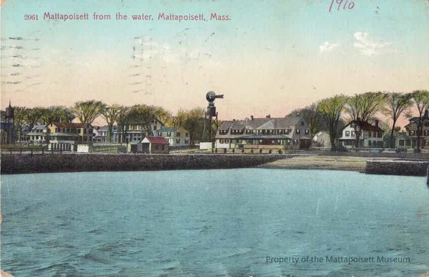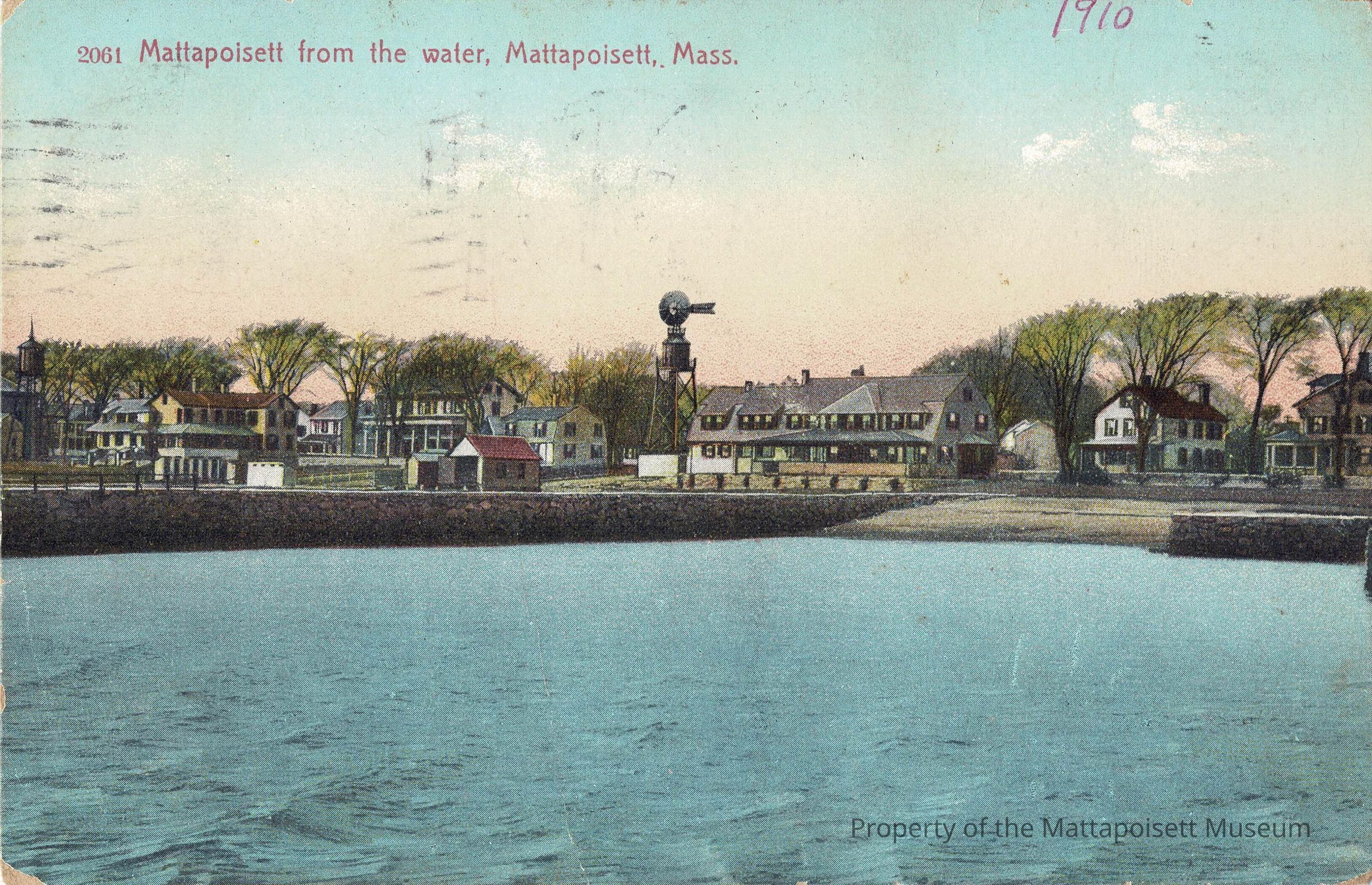 Hand-colored postcard showing Mattapoisett from the water, Mattapoisett, Mass. Hand-written address to Mrs. Bessie Denham, #917 Delaware St., Scranton, Penn. Postmarked Cambridge, Mass, Nov 16, 1910.Collection