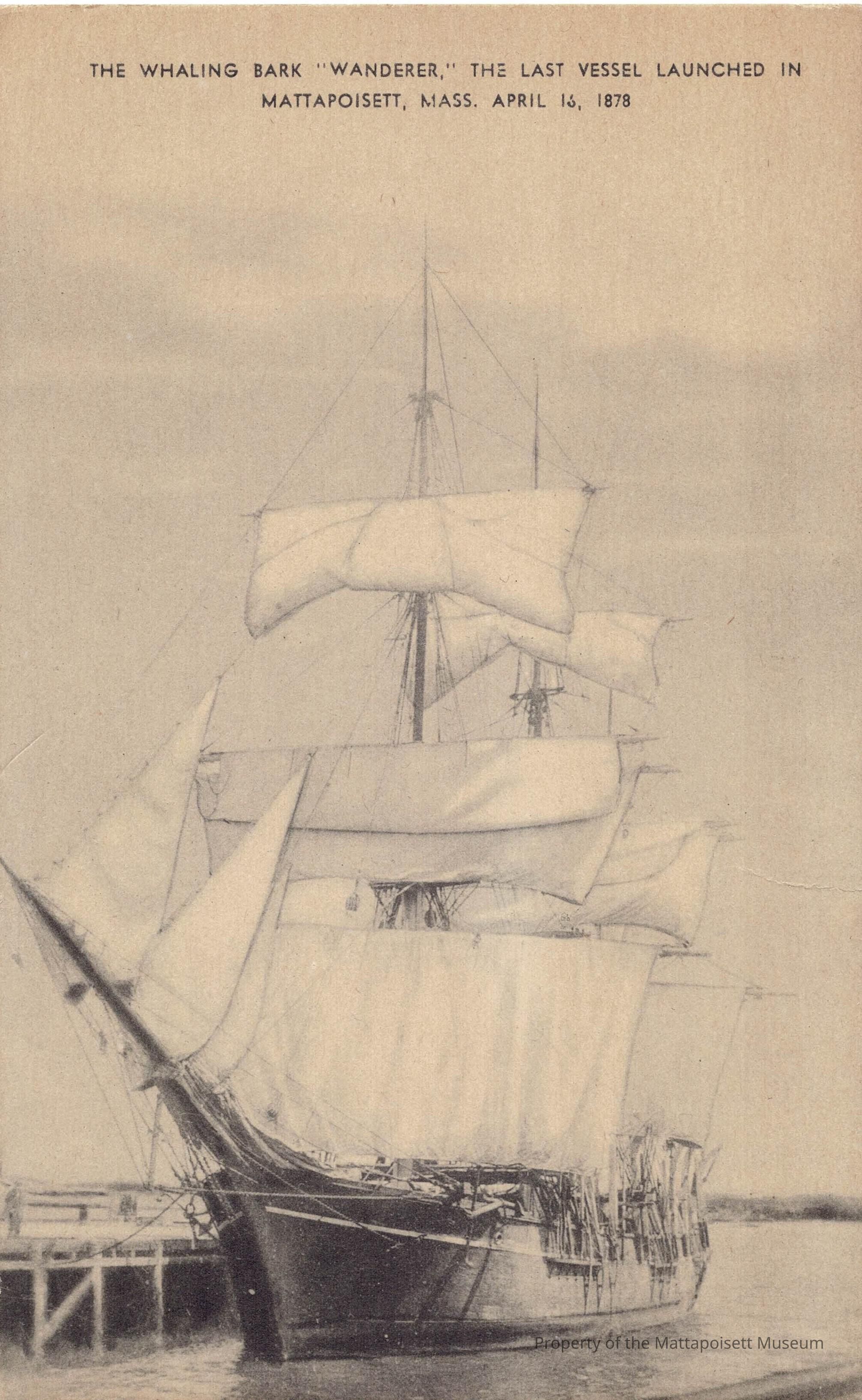 Black and white postcard showing The Whaling Bark "Wanderer", The Last Vessel Lanched in Mattapoisett, Mass. April 14 1878.Collection