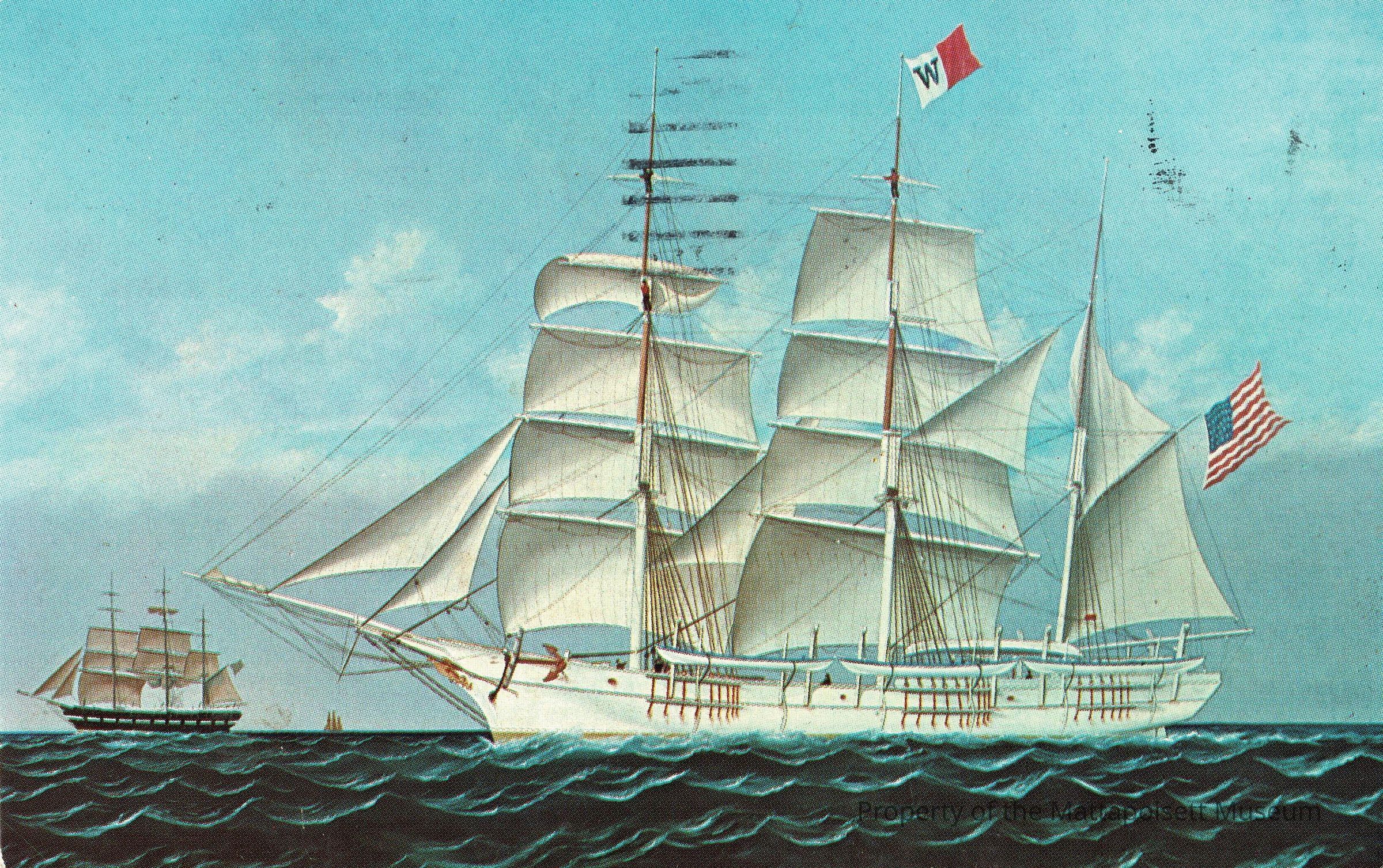 Colored postcard showing a painting of the whaleship WANDERER, built 1878 at Mattapoisett, Massachusetts. Hand-written note from Mellie Masterson to Mr. and Mrs. Joseph Nunes, River Road, Mattapoisett, Mass. Postmarked Boston, Mass, dated 21 October 1969.Collection