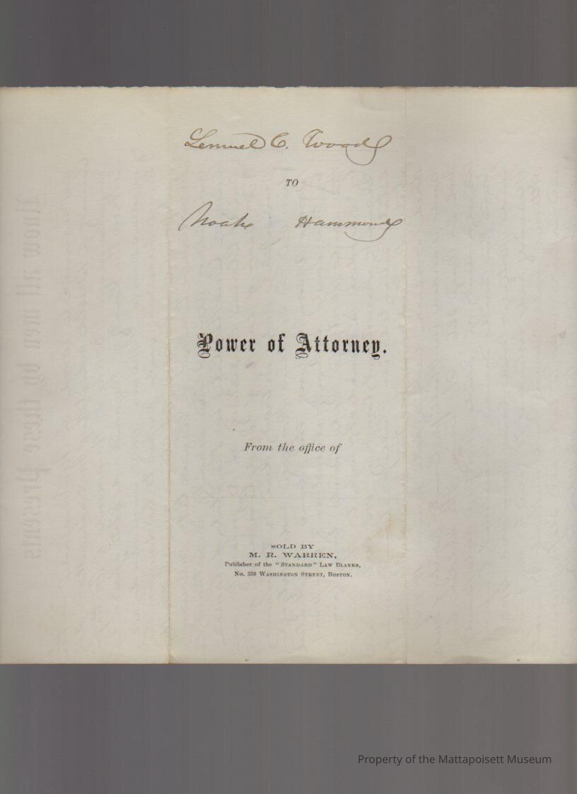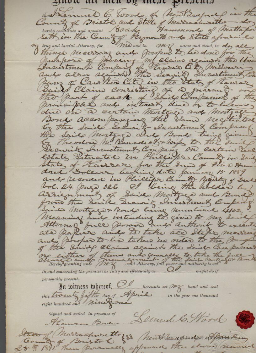 Lemuel C. Woods of New Bedford, Power of Attorney to Noah Hammond to represent in all matters and claims concerning bonds or mortgages assigned by Security Investment Company of Cawker City, KS and Union Investment Company, Kansas City, MO, guaranteed by same.Collection