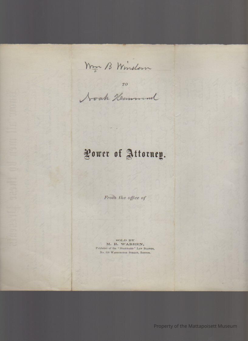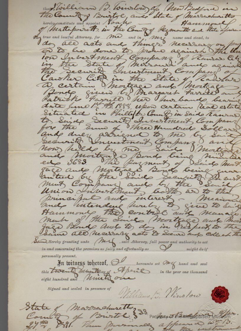 William B. Winslow of New Bedford, Power of Attorney to Noah Hammond to represent in all matters and claims concerning bonds or mortgages assigned by Security Investment Company of Cawker City, KS and Union Investment Company, Kansas City, MO, guaranteed by same.Collection