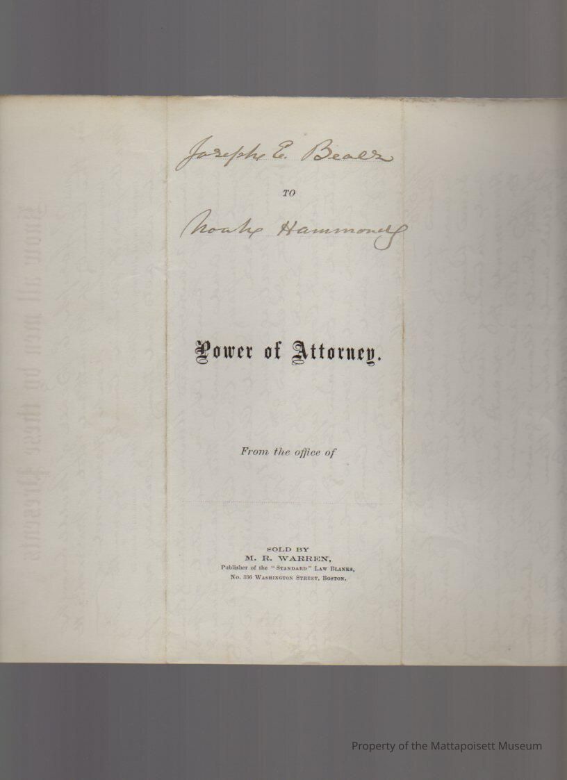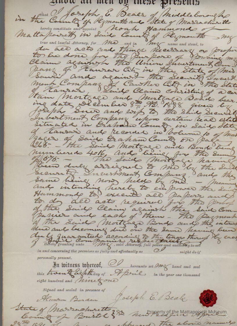 Joseph E. Beals of Middleboro, Power of Attorney to Noah Hammond to represent in all matters and claims concerning bonds or mortgages assigned by Security Investment Company of Cawker City, KS and Union Investment Company, Kansas City, MO, guaranteed by same.Collection