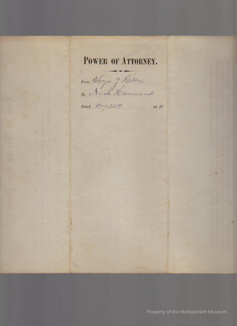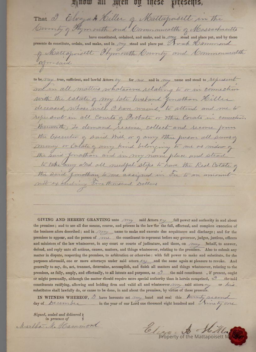 Eliza A. Hiller, administrator to estate of late husband Jonathan Hiller, Power of Attorney to Noah Hammond, represent in matter in connection with estate.Collection