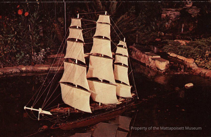 Colored postcard showing A Model Clipper Ship afloat on the pond. Pleasant View Gift Shop, Route 6, Mattapoisett, Massachusetts.Collection