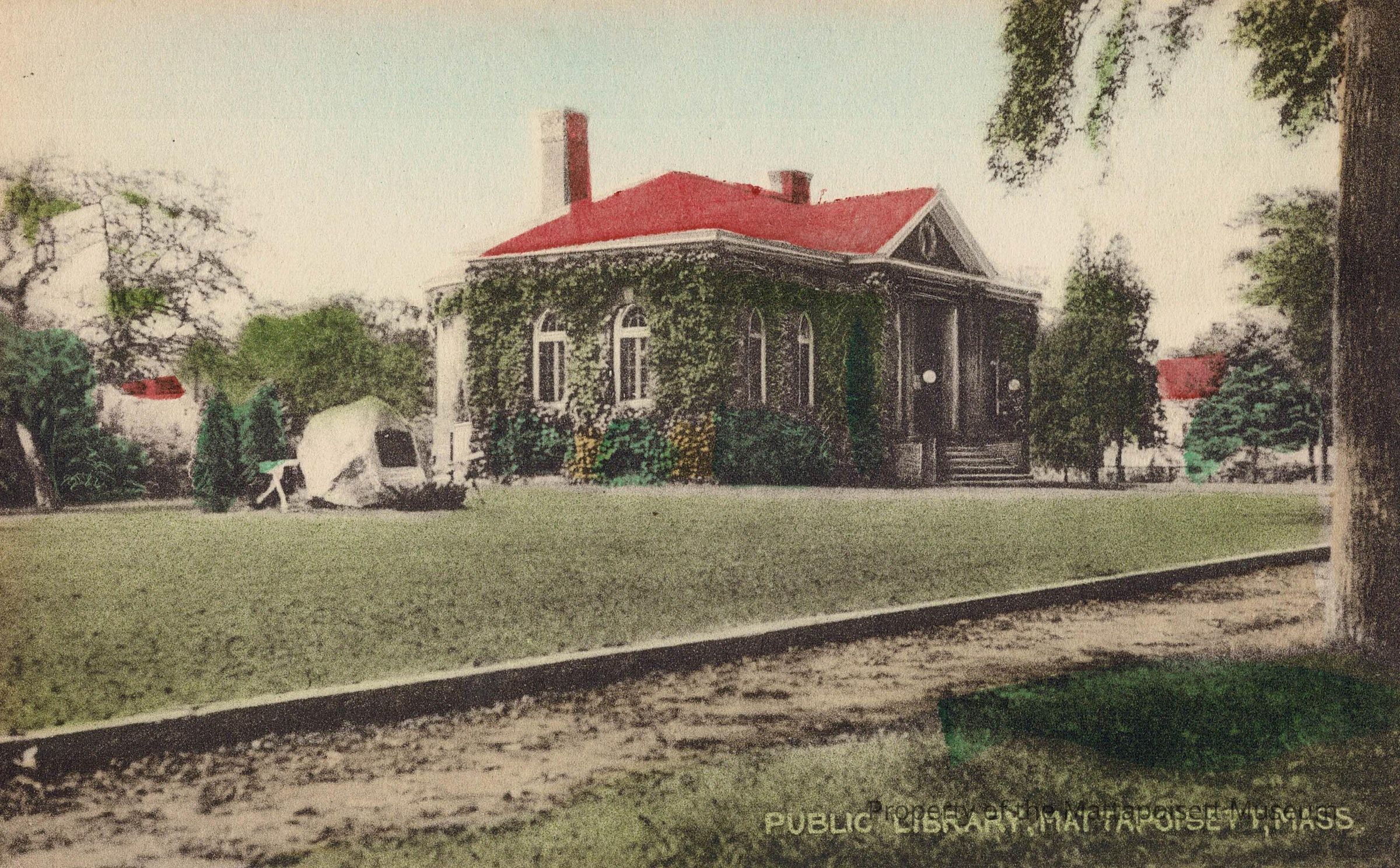 Hand-colored postcard showing Public Library, Mattapoisett, Mass. (2 Copies)Collection