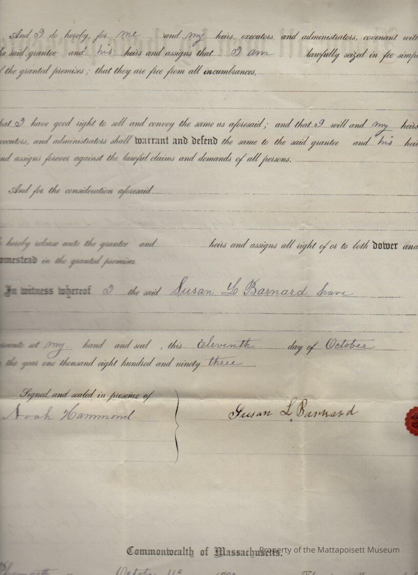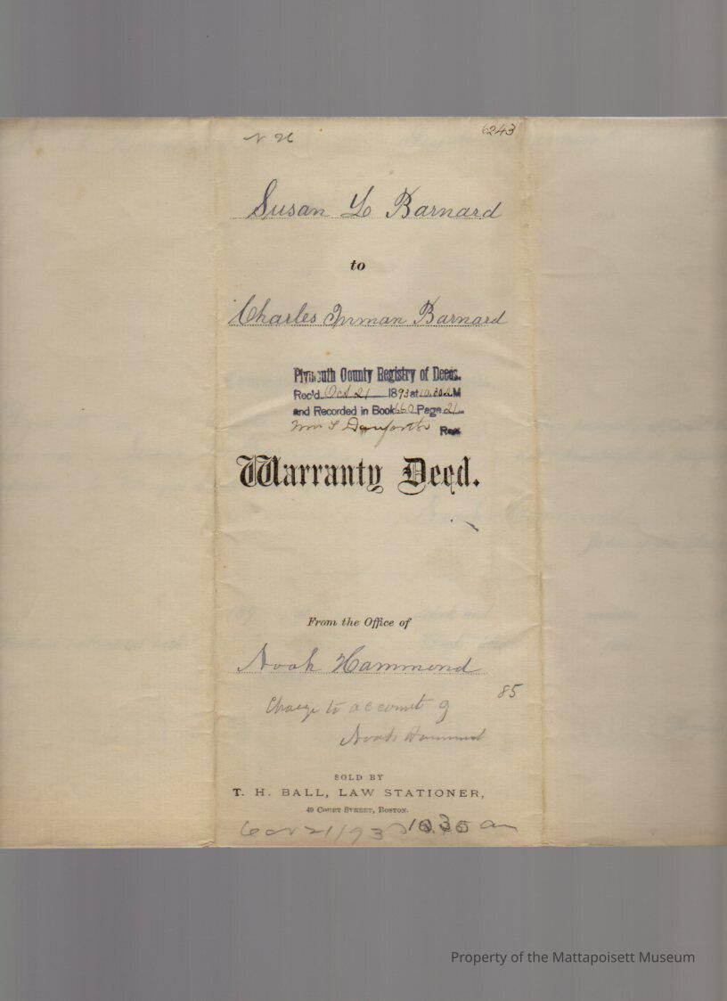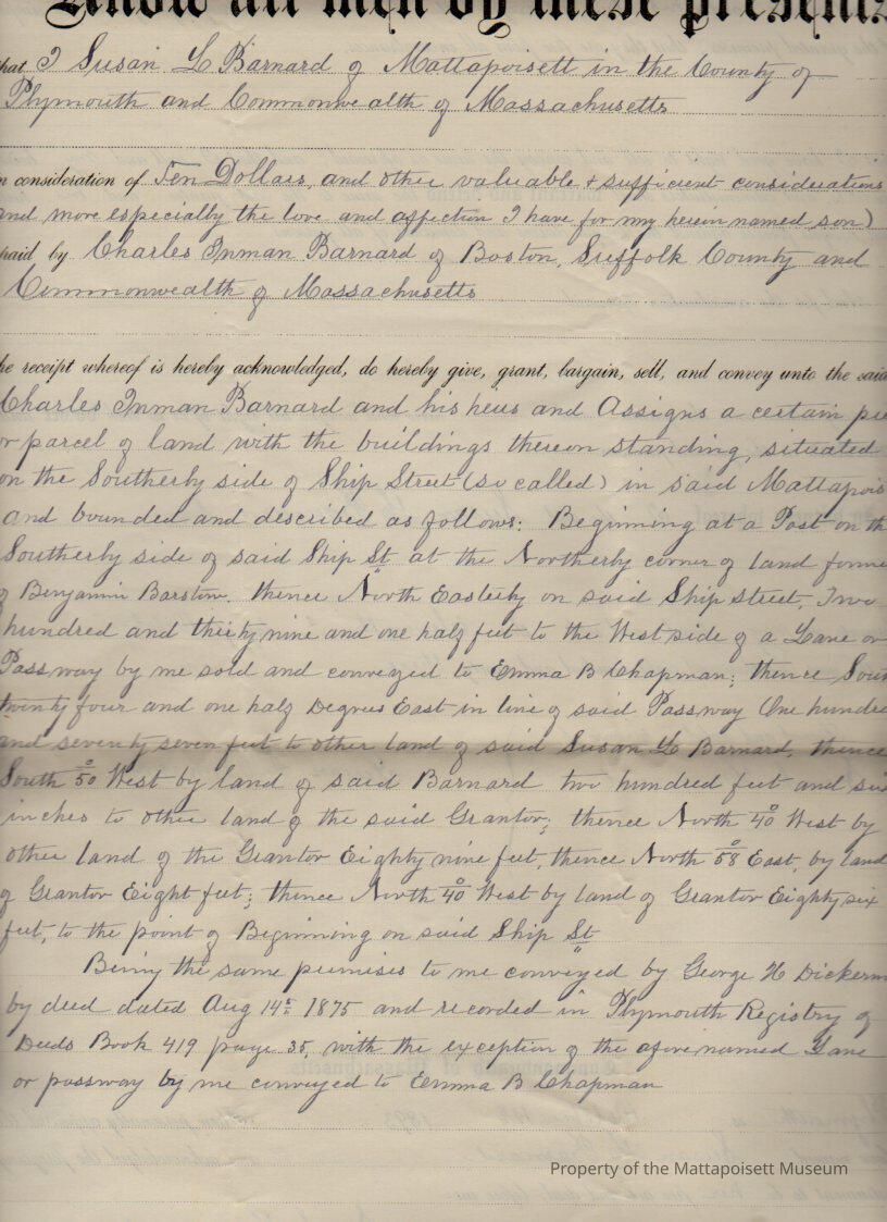 Susan L. Barnard to her son Charles Inman Barnard of Boston, land on the south side of Ship Street, land and buildings, $10 and other valuable and sufficient considerations and love and affections for son.Collection