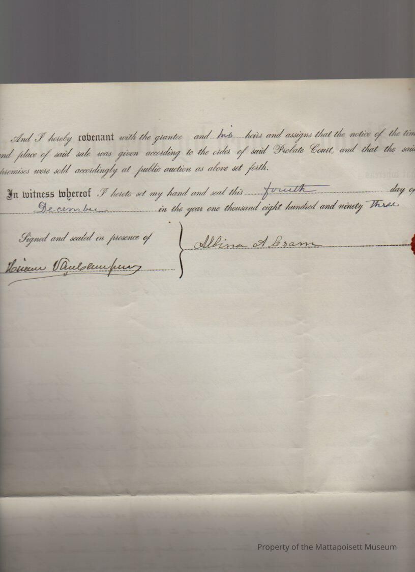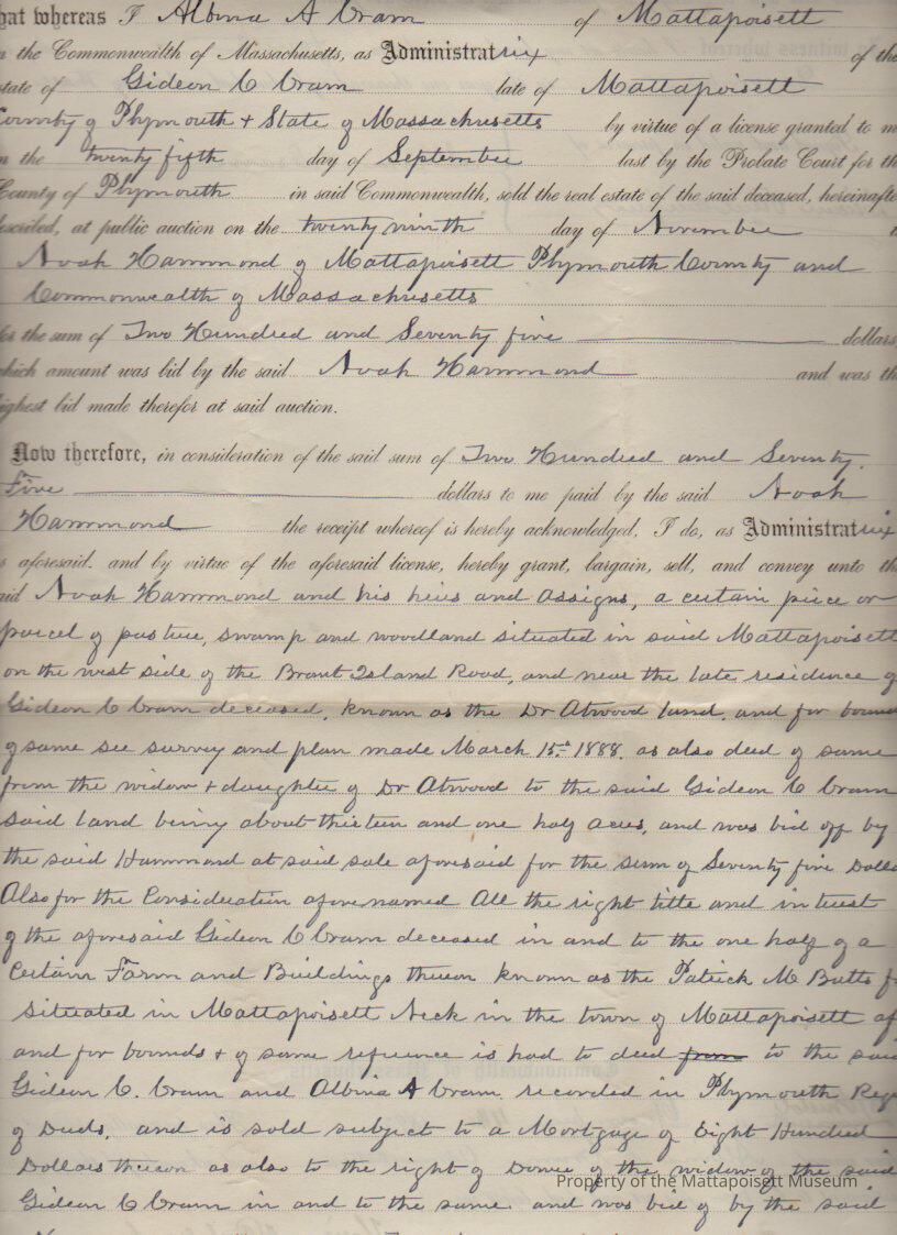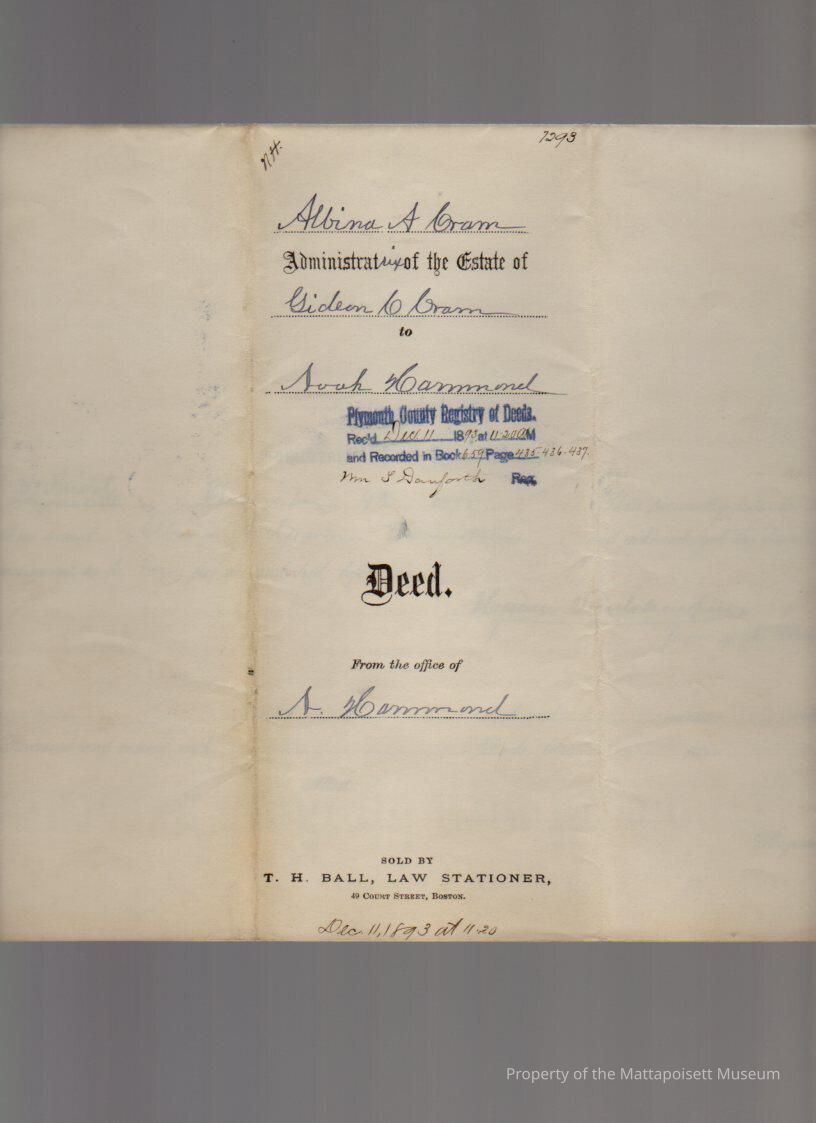 Albina A. Cram, administrator of the estate of Gideon C. Cram, to Noah Hammond, to sell pasture, swamp & woodland, west of Brandt Island Road, plus survey for $275.Collection