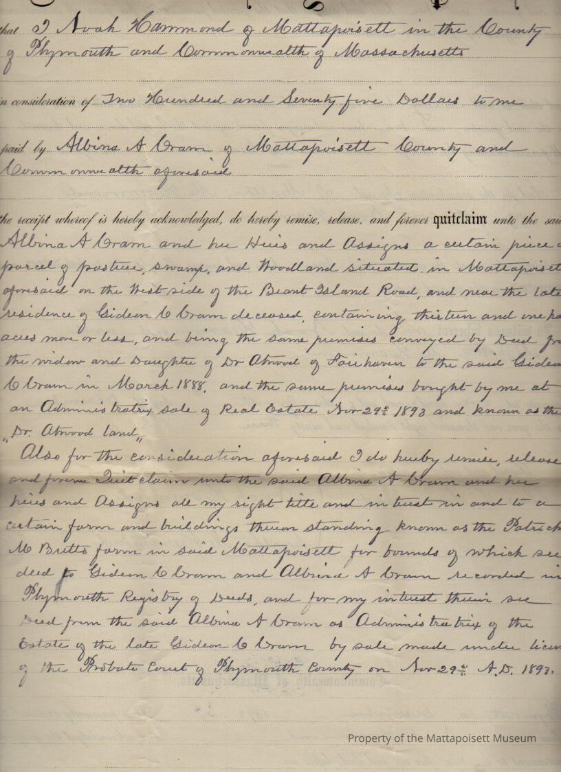 Noah & Martha M. Hammond to Albina A. Cram, 13 1/2 acres of pasture, swamp or woodland, west of Brandt Island Road, farm and buildings for $275.Collection