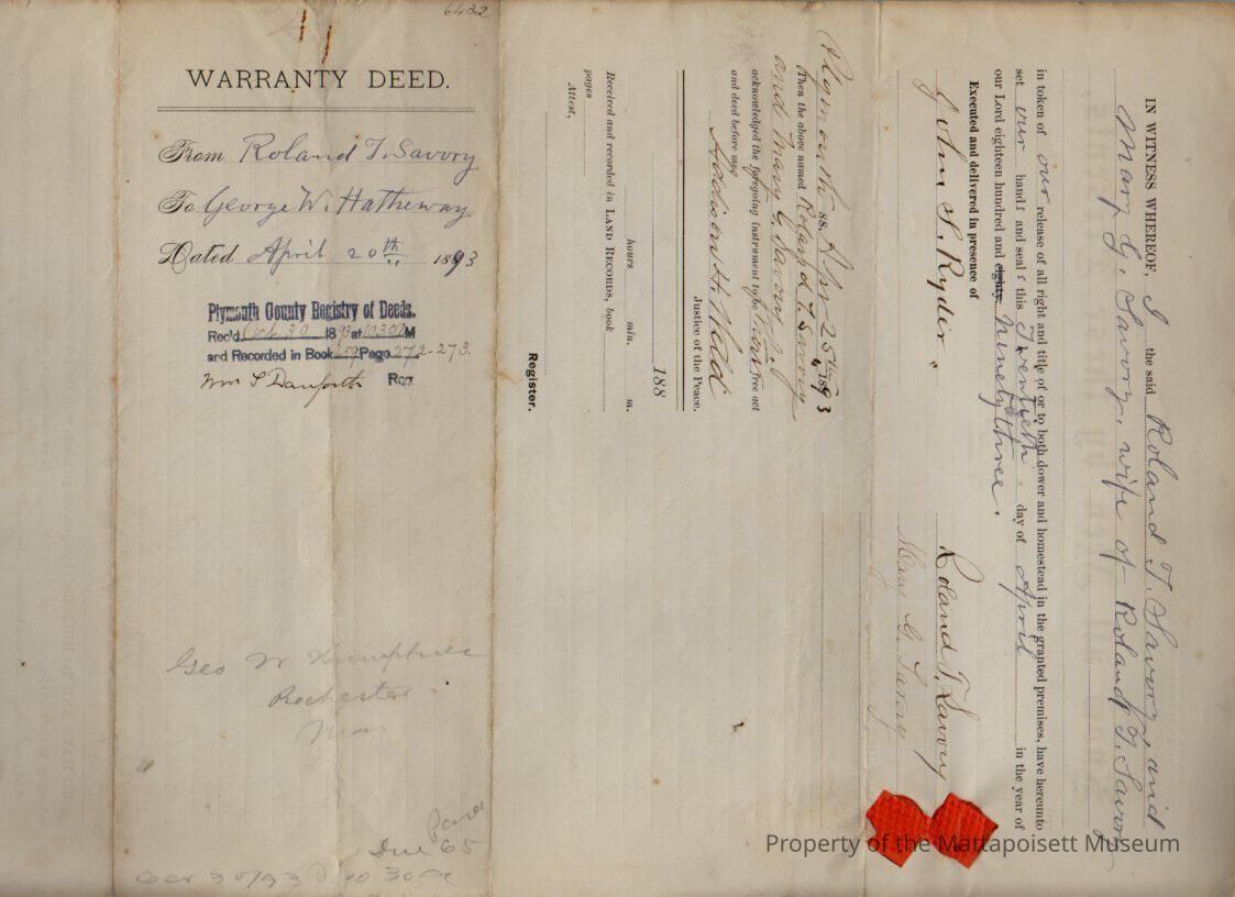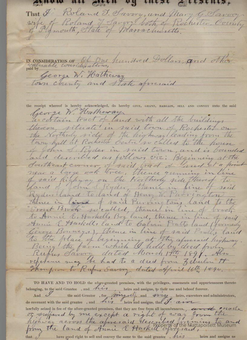 Roland T. & Mary Mary G. Savory to George Hathaway, farm and buildings in Rochester north of highway for $1 and other valuable considerations.Collection