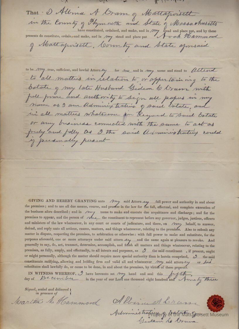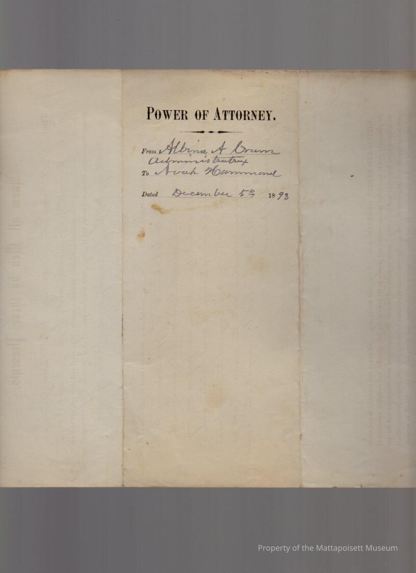 Albina A. Cram, Power of Attorney to Noah Hammond to represent in all matters and claims concerning bonds or mortgages assigned by Security Investment Company of Cawker City, KS and Union Investment Company, Kansas City, MO, guaranteed by same.Collection