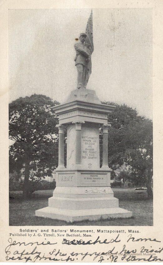 Black and white postcard showing Soldiers' and Sailors' Monument, Mattapoisett, Mass. Hand-written note to Mrs. Ellis Purrington, State Farm, Mass. Postmarked 24 September (date not legible), Mattapoisett, Mass.Collection