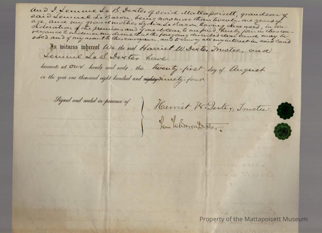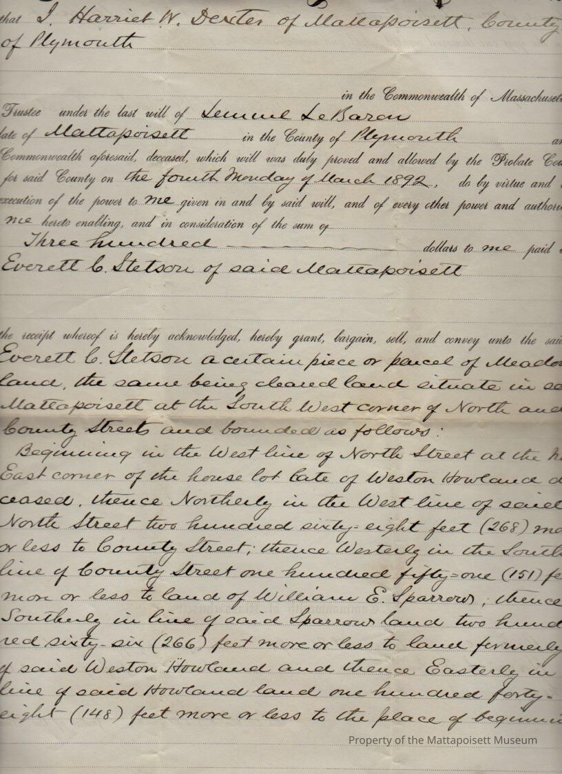 Harriet W. Dexter, administrator to the estate of Lemuel LeBaron, to Everett C. Stetson, meadowland on the corner of North and County Streets for $300. Copy.Collection
