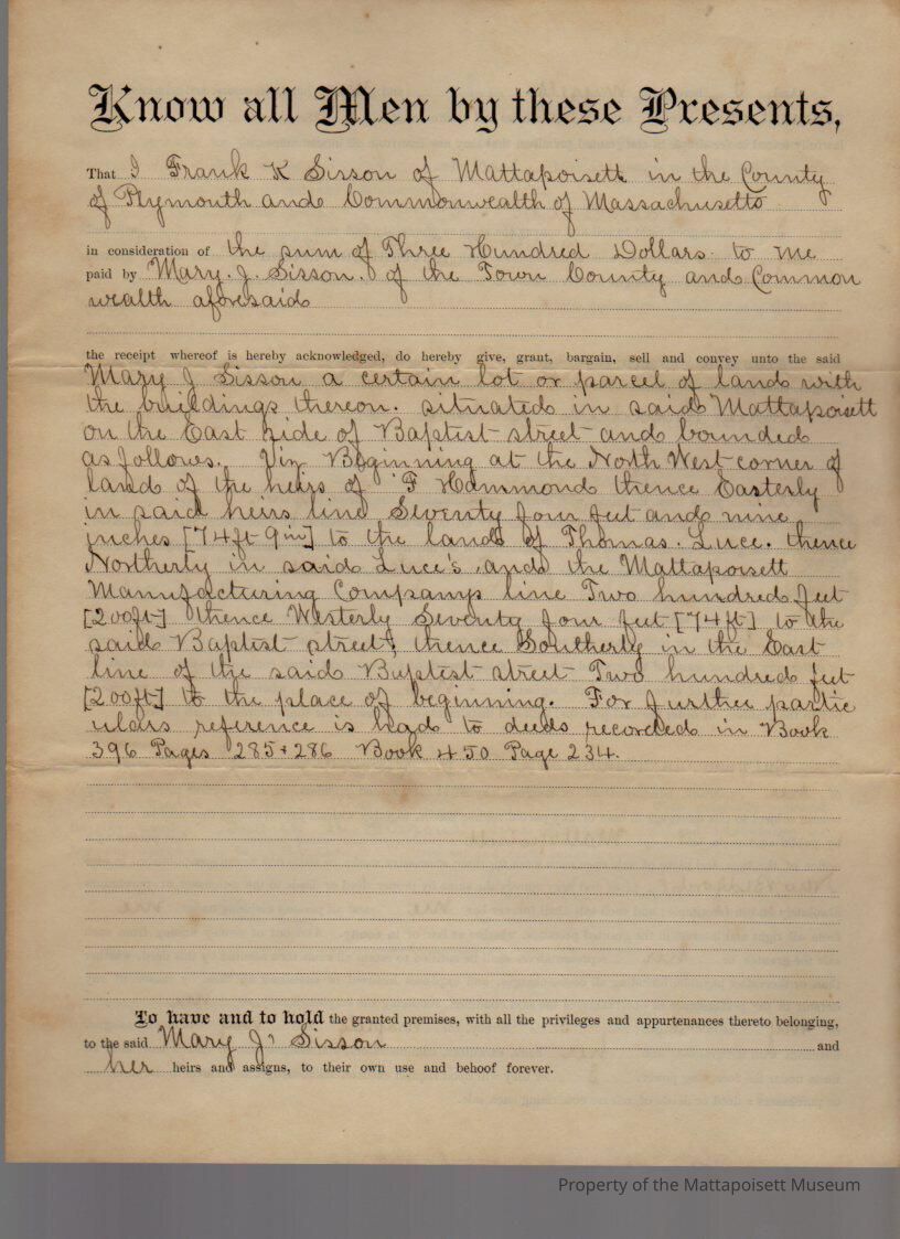 Frank K. & Ida Sisson to Mary J. Sisson, land and buildings east of Baptist Street for $300.Collection