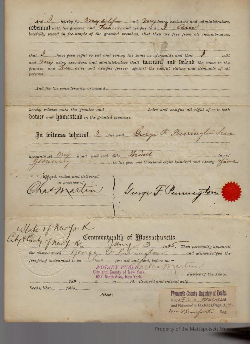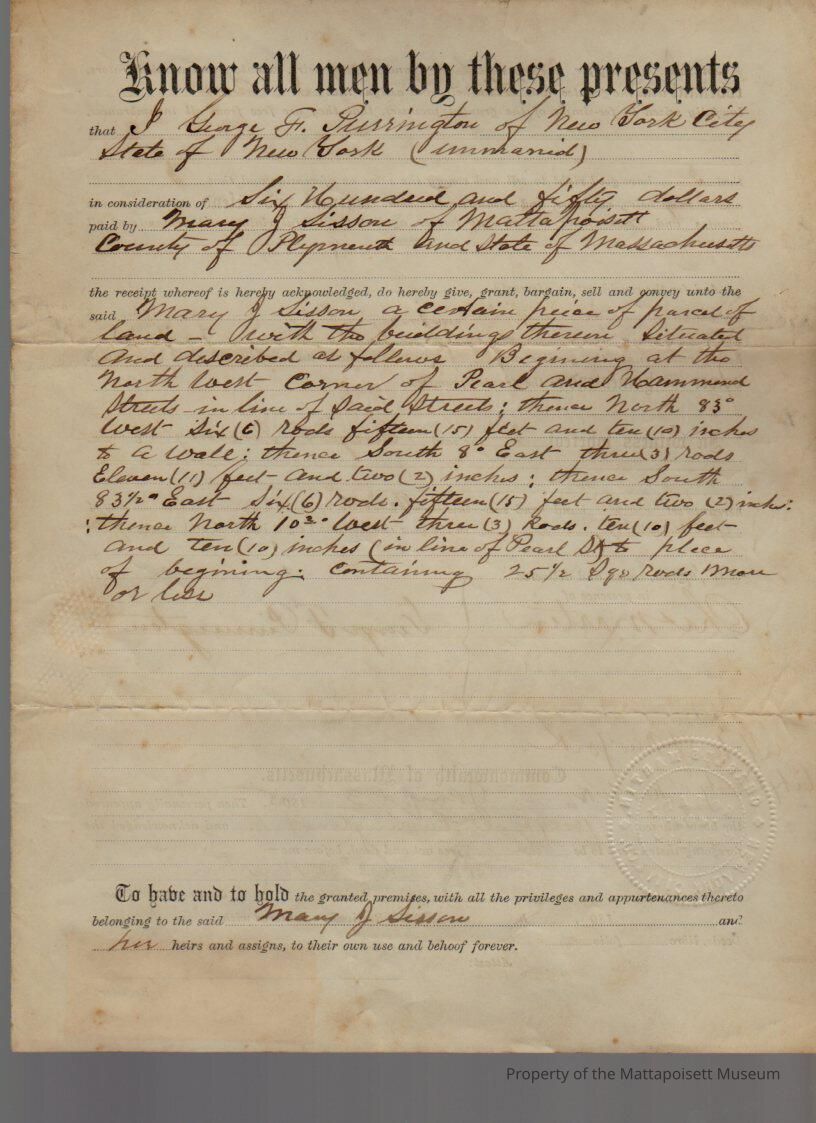 George F. Purrington of New York to Mary G. Sisson, 25 1/2 square rods of land and buildings for $650.Collection