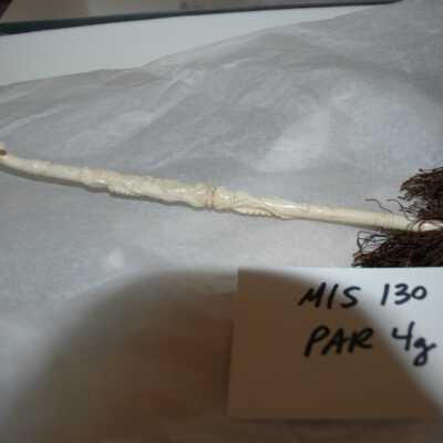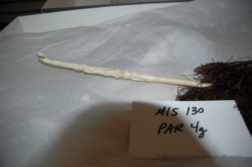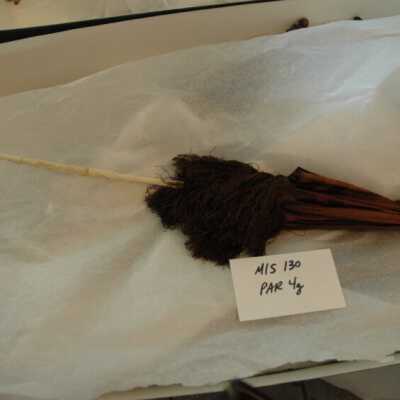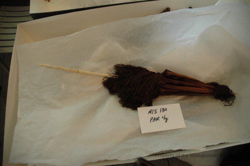 Reddish-brown silk with ivory handle and tip. Brown fringe approx. 4".Collection