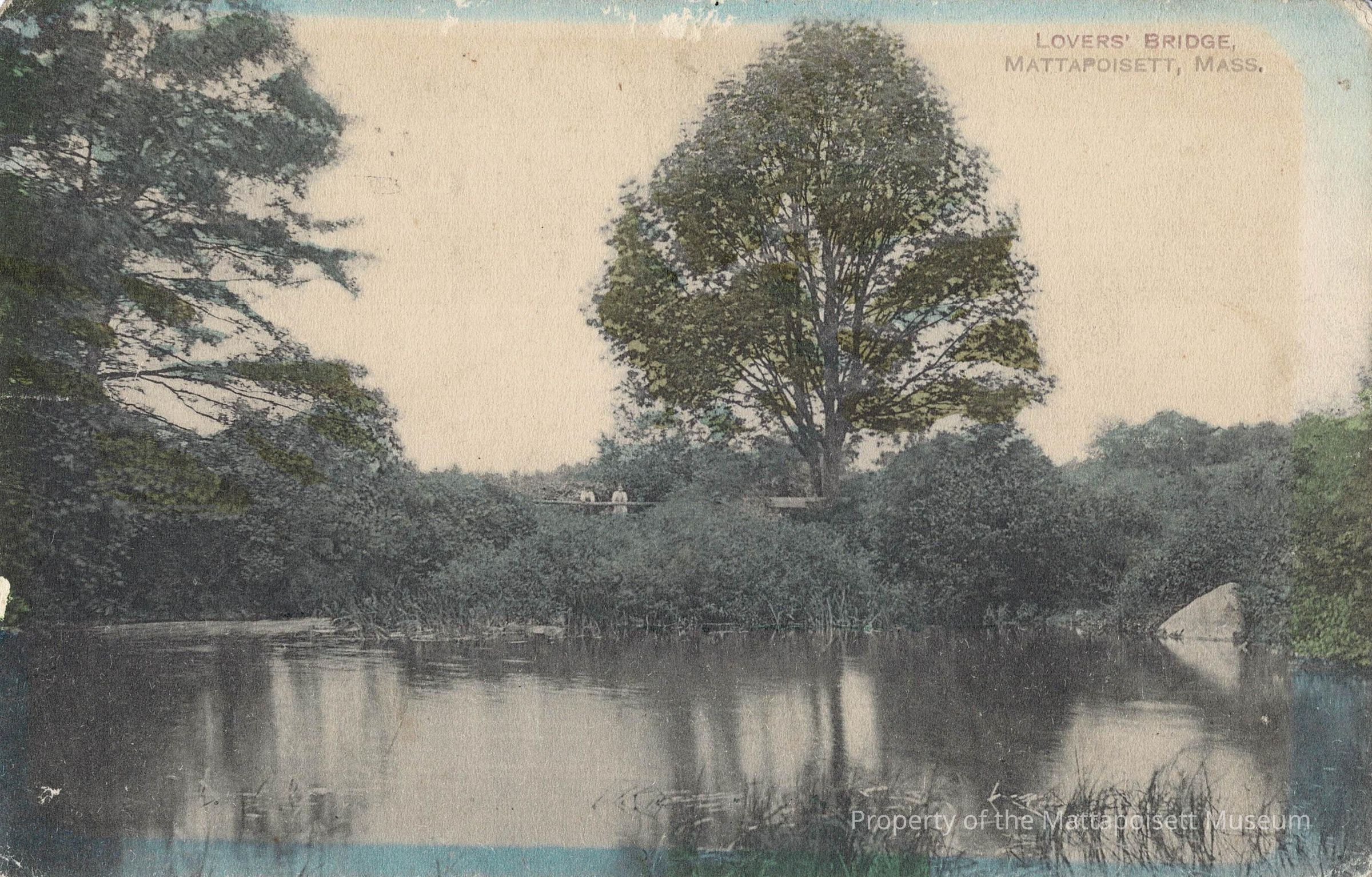 Hand-colored postcard showing Lover's Bridge, Mattapoisett, Mass. Hand-written note to Mr. Anthony DiCosta, Causual U.S.A.A.S, Allentown, PA. Postmarked from Mattapoisett, Mass. on Oct 20, 1917.Collection