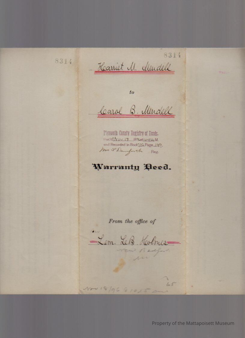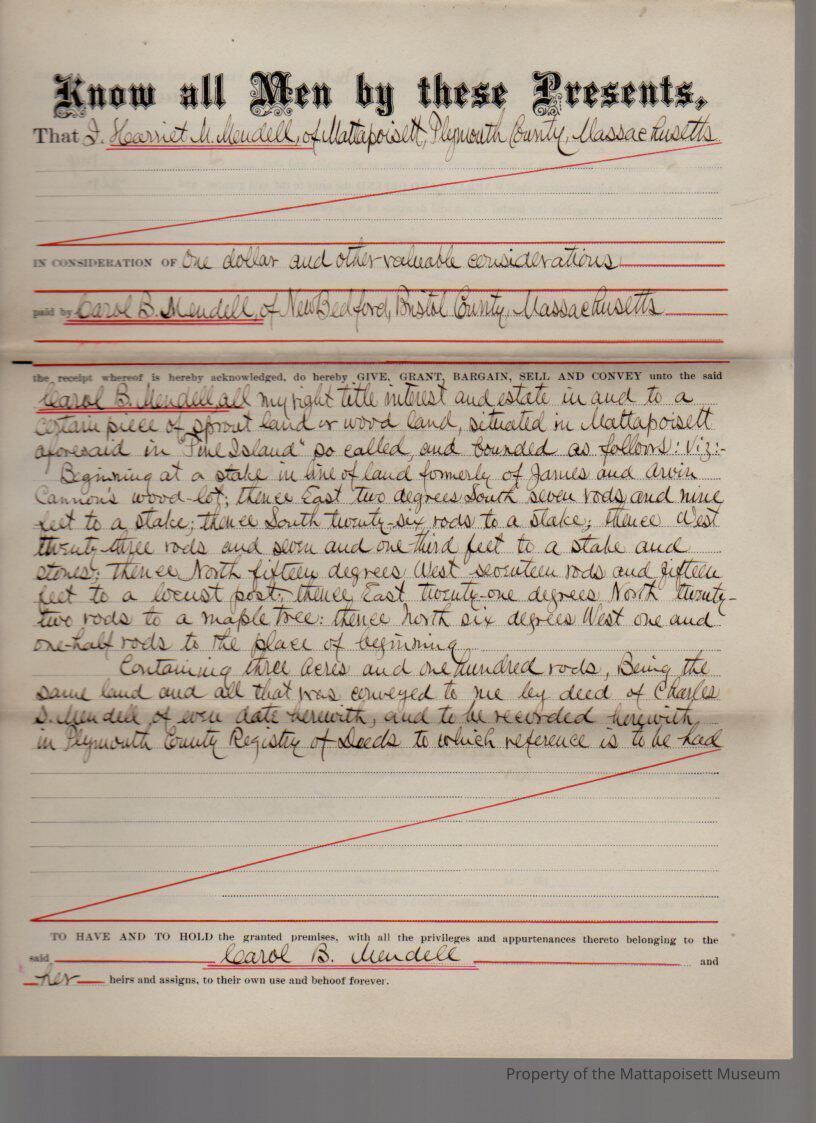 Harriet M. Mendell to Carol B. Mendell, 3 acres, 100 rods of sprout or woodland in Pine Island for $1 and other valuable considerations.Collection