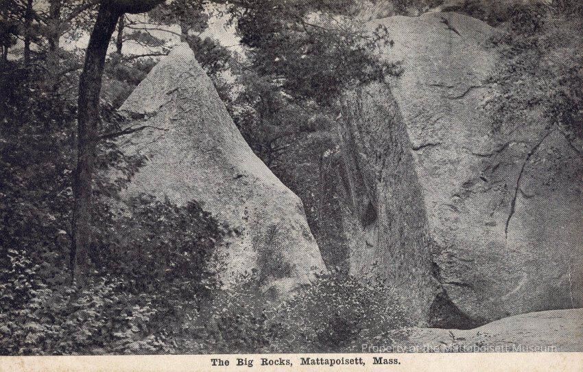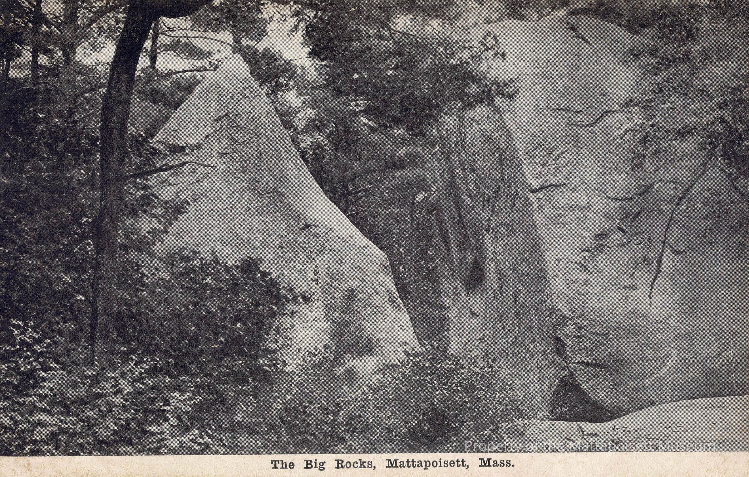 Black and white postcard showing The Big Rocks, Mattapoisett, Mass.Collection