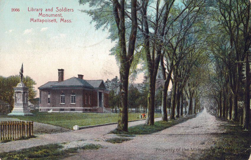 Hand-colored postcard showing the Library and Soldiers Monument, Mattapoisett, Mass. Postmarked from Mattapoisett, Mass., Aug 6, 1908. Hand-written note stating "Donated by Florence Flower", 2/27/76.Collection