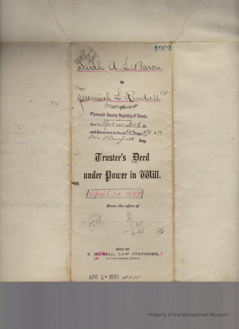 Sarah Ann LeBaron, trustee of the late James LeBaron to Jeremiah L. Randall, 25 acres, northwest part of Mattapoisett, east side of the road to Tinkhamtown for $220.Collection