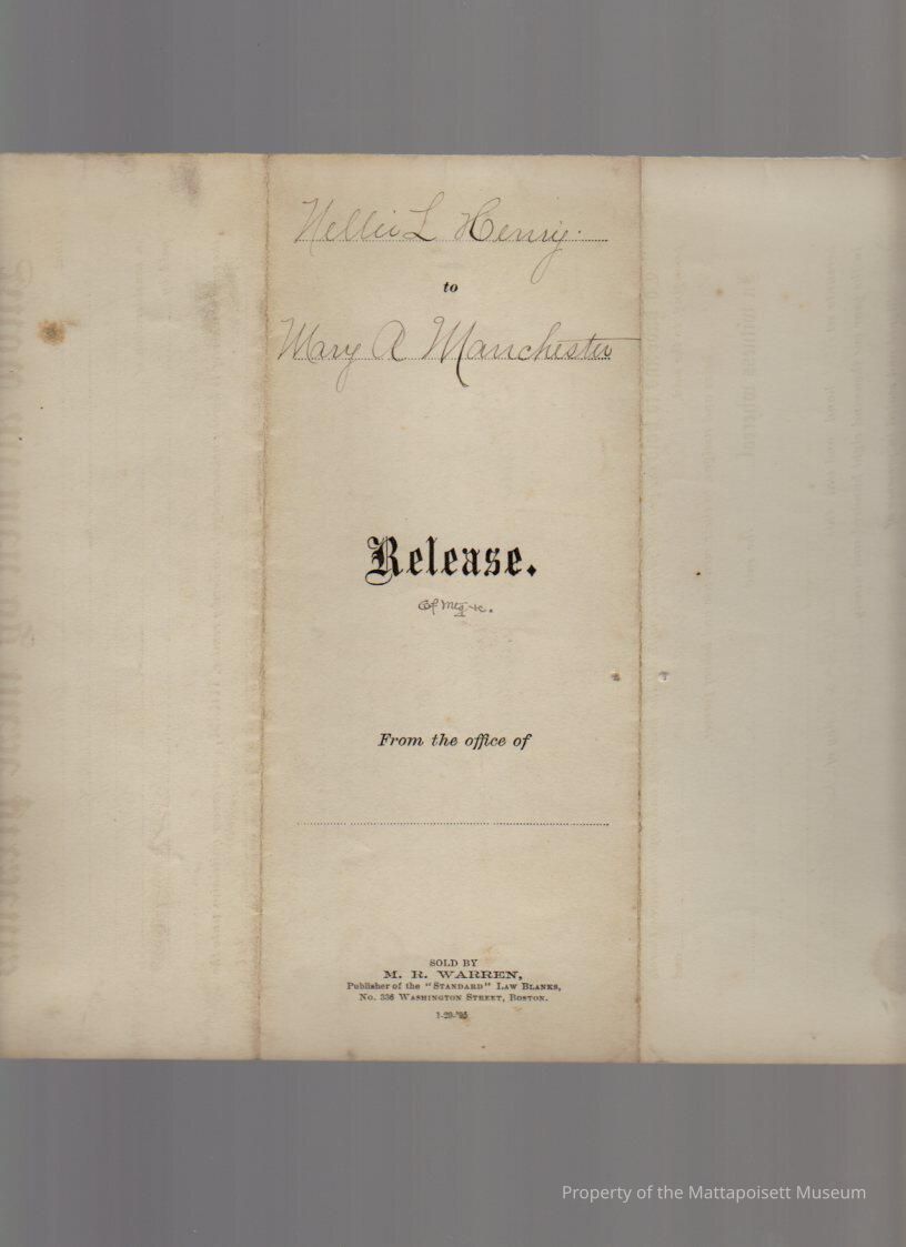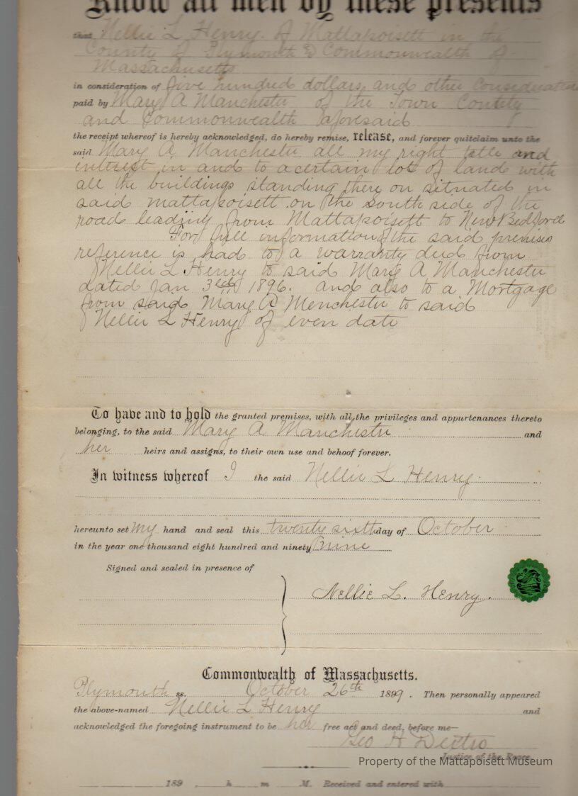 Nellie L. Henry to Mary A. Manchester, land and buildings south of the street from Mattapoisett to New Bedford for $500 and other considerations.Collection
