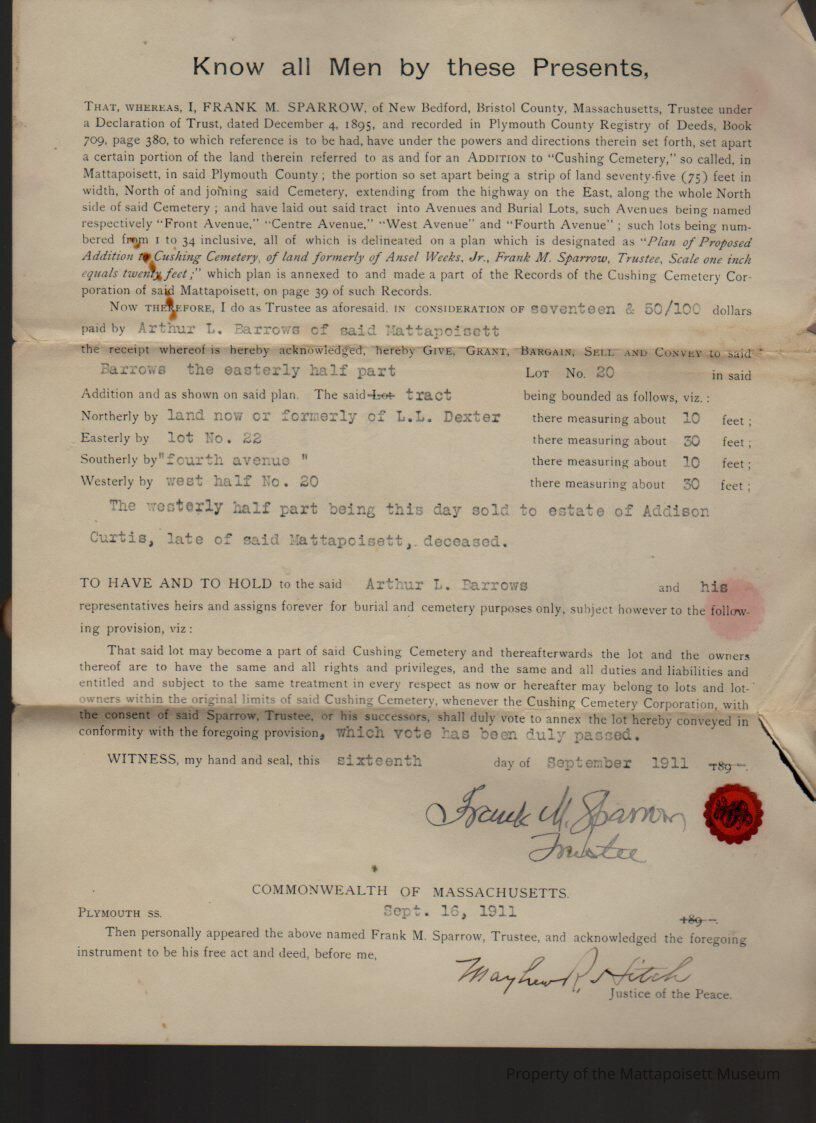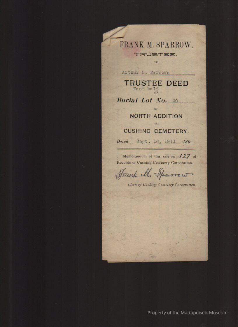 Frank M. Sparrow of New Bedford, trustee of an addition to Cushing Cemetery to Arthur L. Barrows, Lot 20, for $17.50.Collection