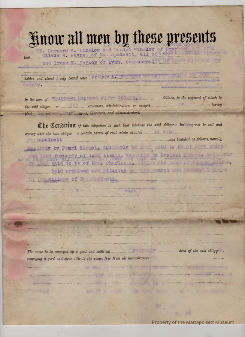 Bernard B. Winslow and Daniel Winslow of Brockton, Olivia S. Payne of Mattaposiett, Irene W. Taylor of Lynn to Arthur L. Barrows, land on Pearl Street between Church and Hammond Streets for $1,450.Collection