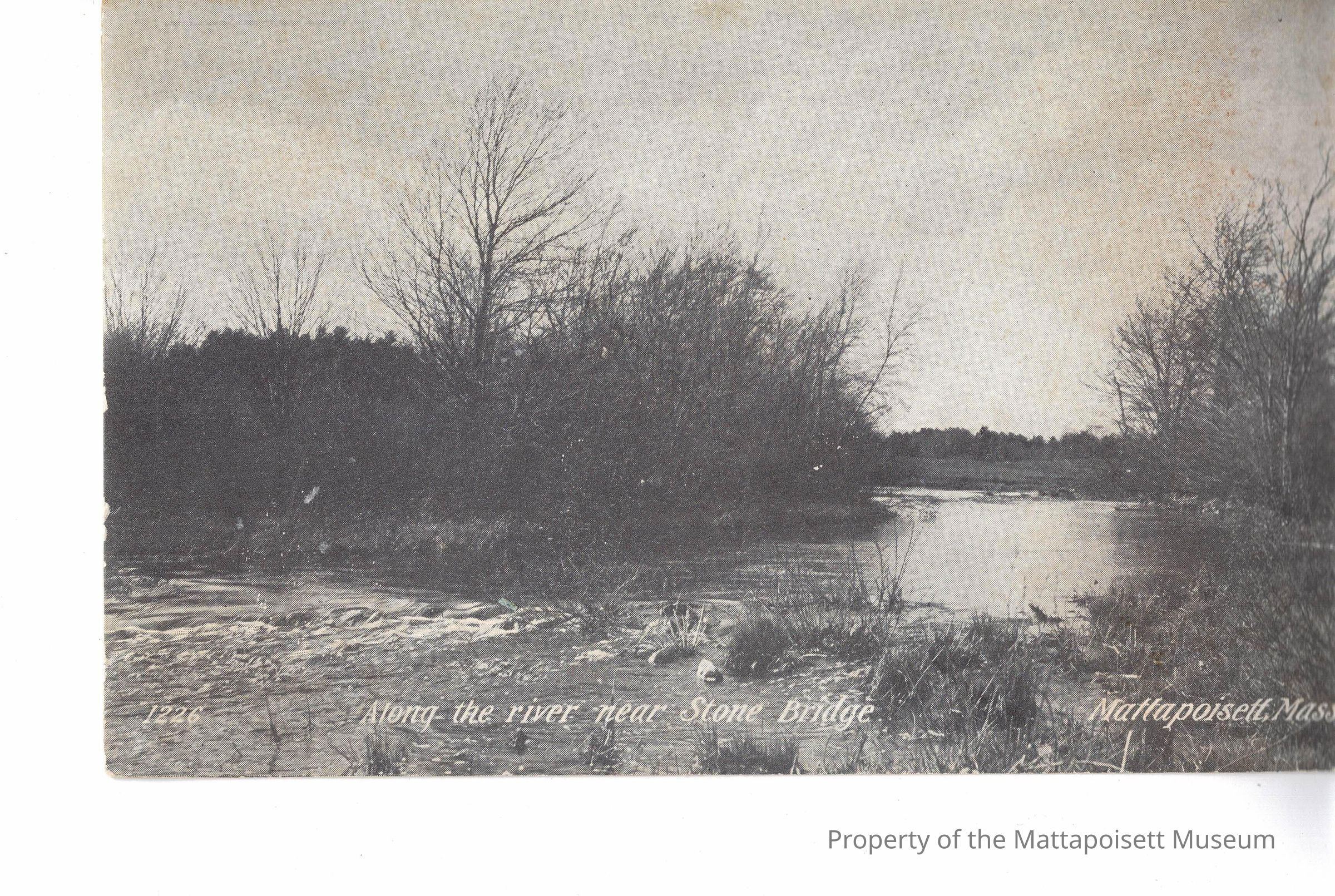 Black and white postcard showing Along The River Near Stone Bridge, Mattapoisett, Mass. Pre-address Alice C. Ordway, North Street, Mattapoisett, Massachusetts.Collection
