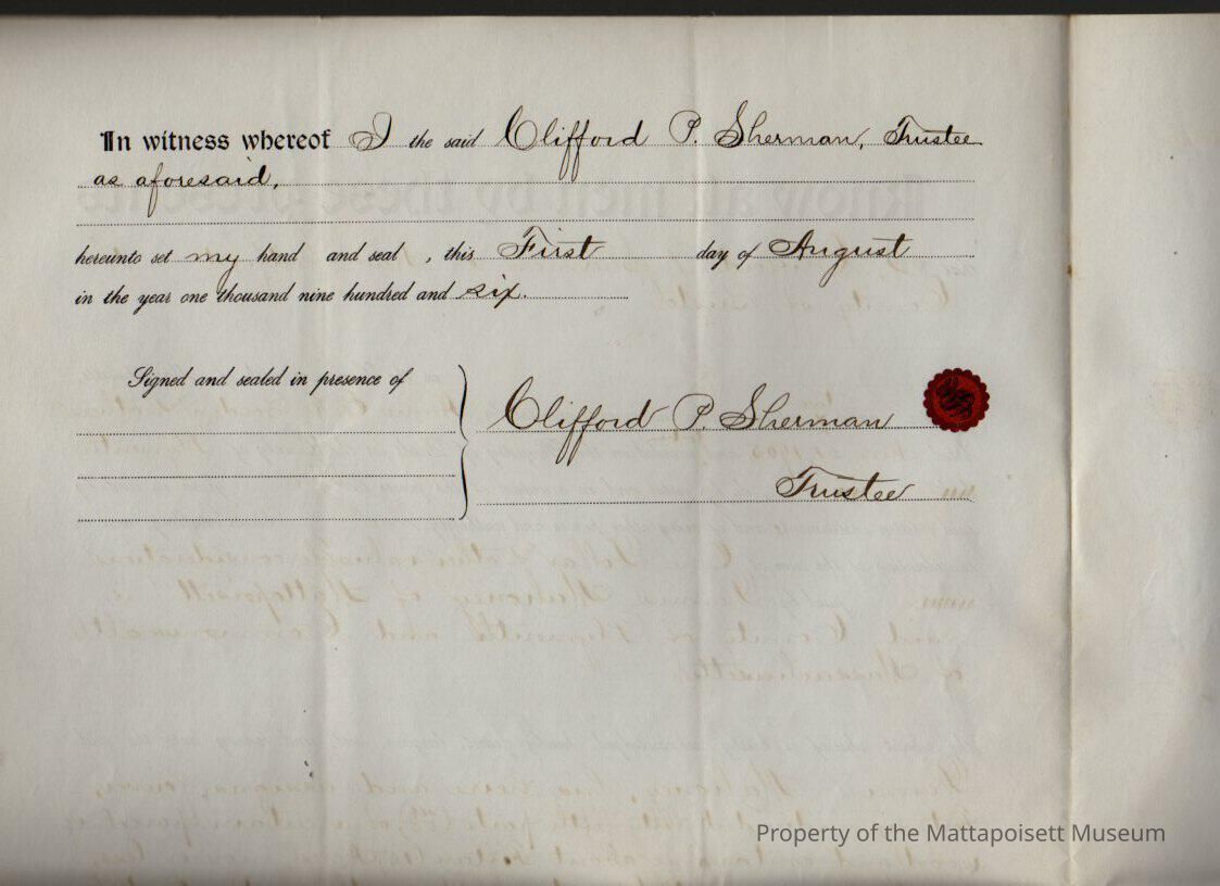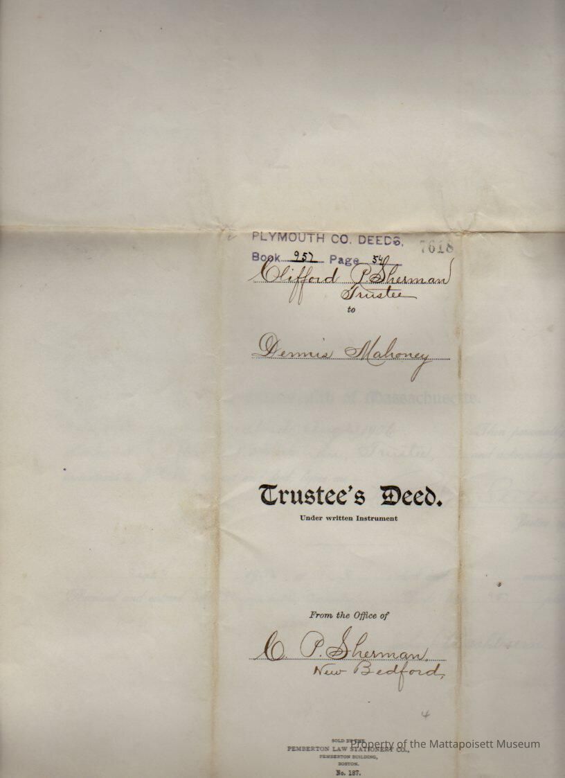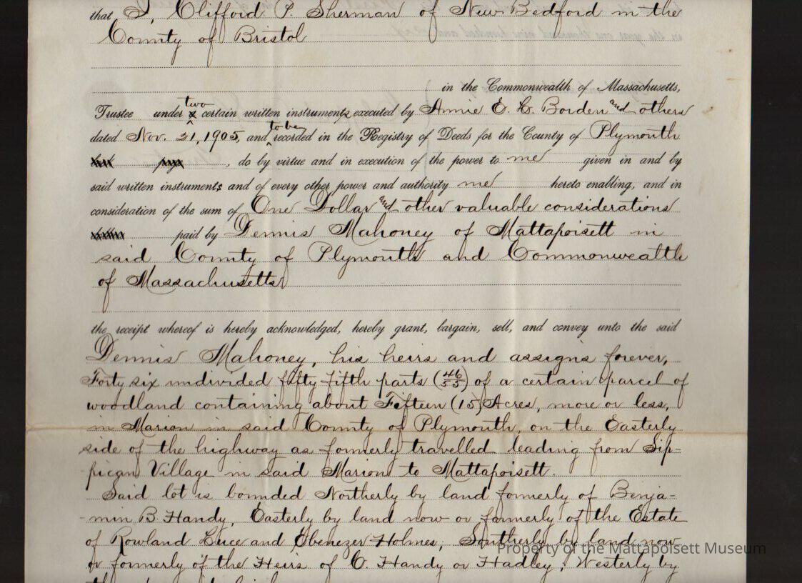Clifford P. Sherman of New Bedford, trustee of Annie E. L. Borden and others to Dennis Mahoney, 46/55th parts of 15 acres of woodland in Marion on the easterly side of the highway from Sippican Village to Mattapoisett for $1 and other valuable considerations.Collection