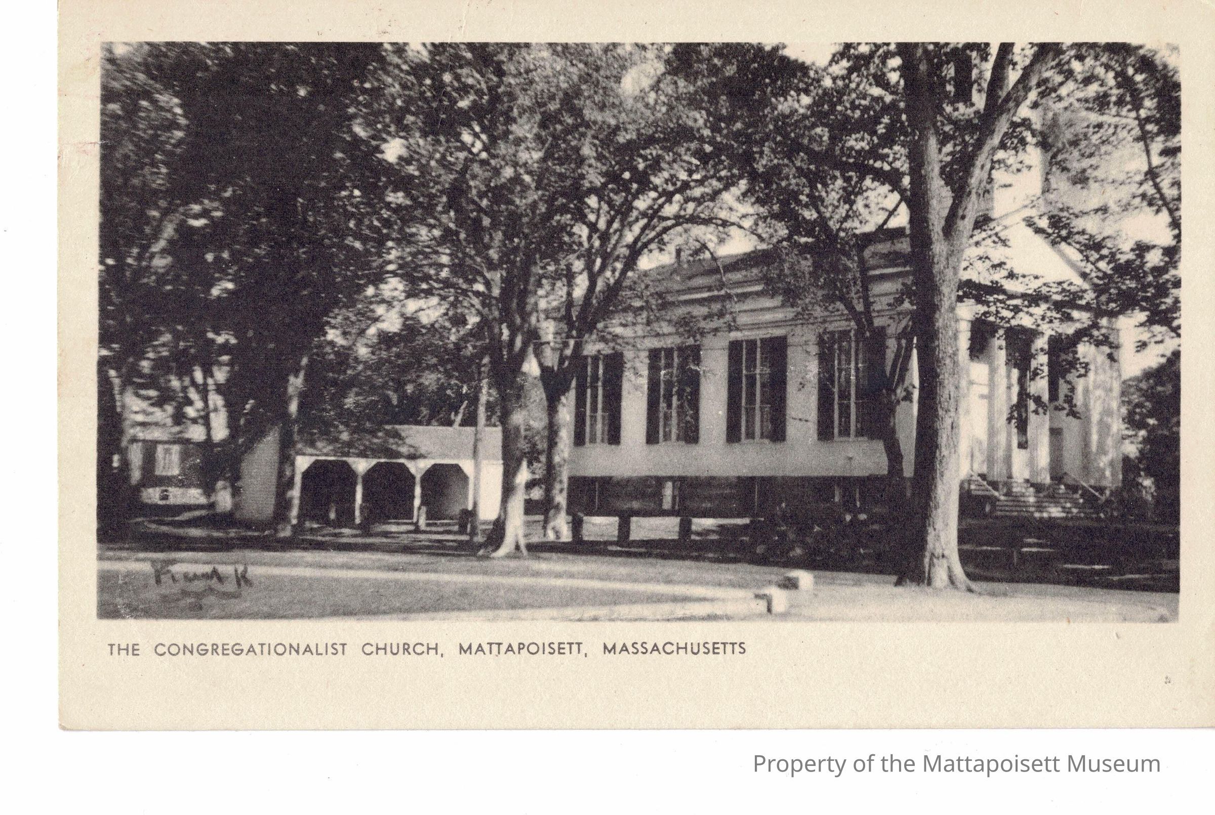 Black and white postcard showing The Congregationalist Church, Mattapoisett, Massachusetts. Hand-written note from Gladys to Mrs. Mildren Long, East Taunton, Mass. Postmarked from Mattapoisett, Mass on May 24 (no year date).Collection