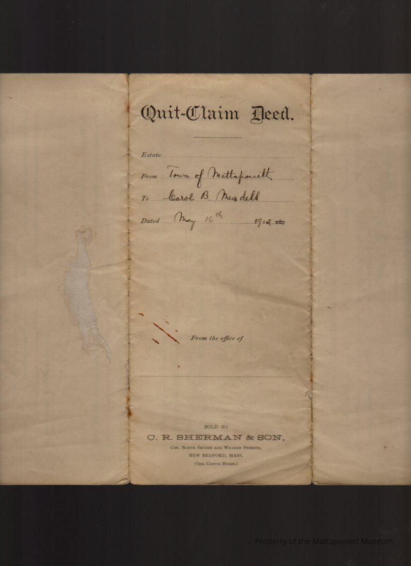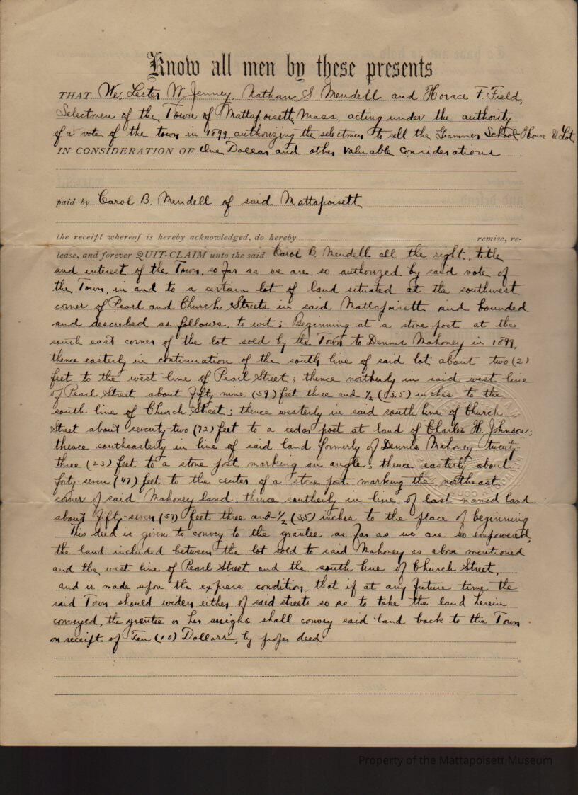 Lester W. Jenney, Nathan S. Mendell and Horace F. Field, Selectmen of the Town of Mattapoisett to Carol B. Mendell, lot of land at the southwest forner of Pearl and Church Streets for $1 and other valuable considerations.Collection