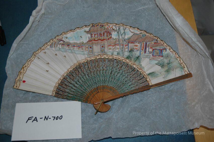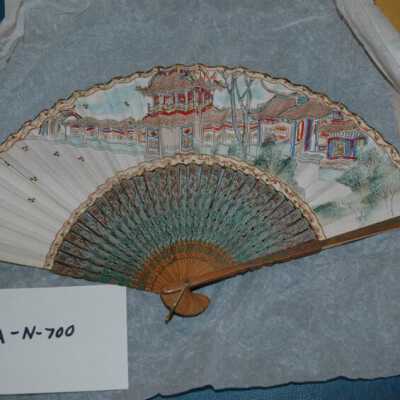 One of three fans. Wood handle, paper, painted pagoda scene.Collection